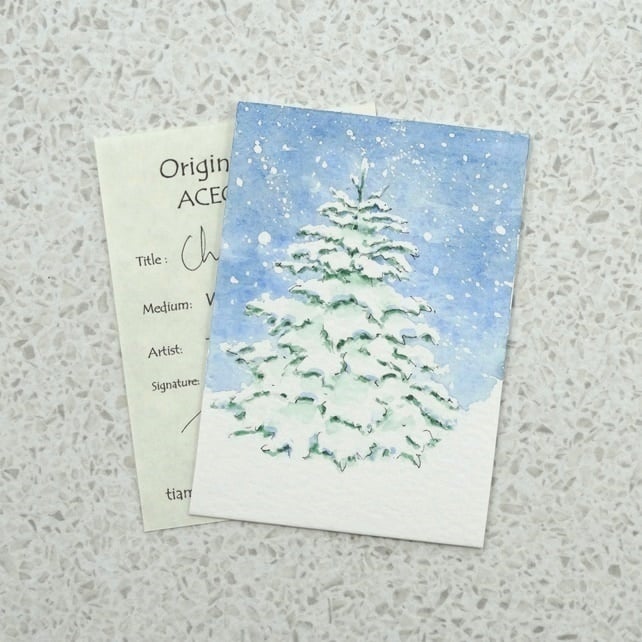 My original ACEO 'Christmas Tree' has been painted using watercolour on 300gm quality watercolour paper. It has been signed on the reverse and comes complete with a signed certificate of authentication and protected in a clear cellophane sleeve. ACEO’s (Art Cards Editions and Originals), are highly collectable and can be mounted, framed, kept in an album or displayed on a miniature easel.