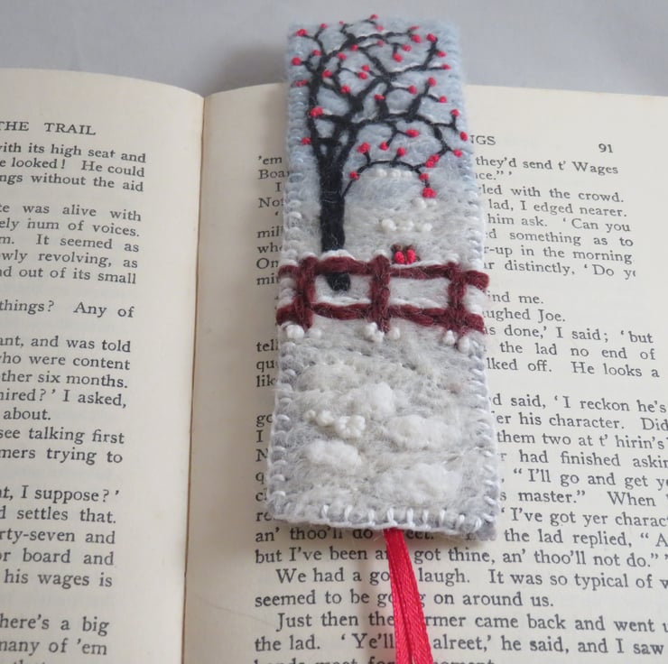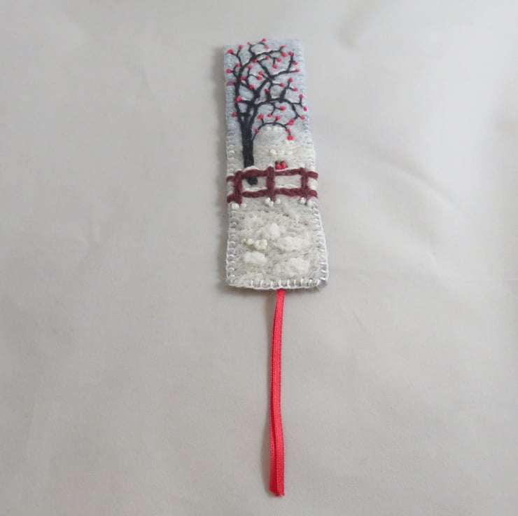 The bookmark is edged in blanket stitch and backed with a second layer of felt. Bright red ribbon tails complete the design.