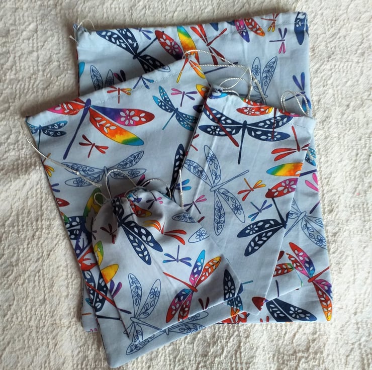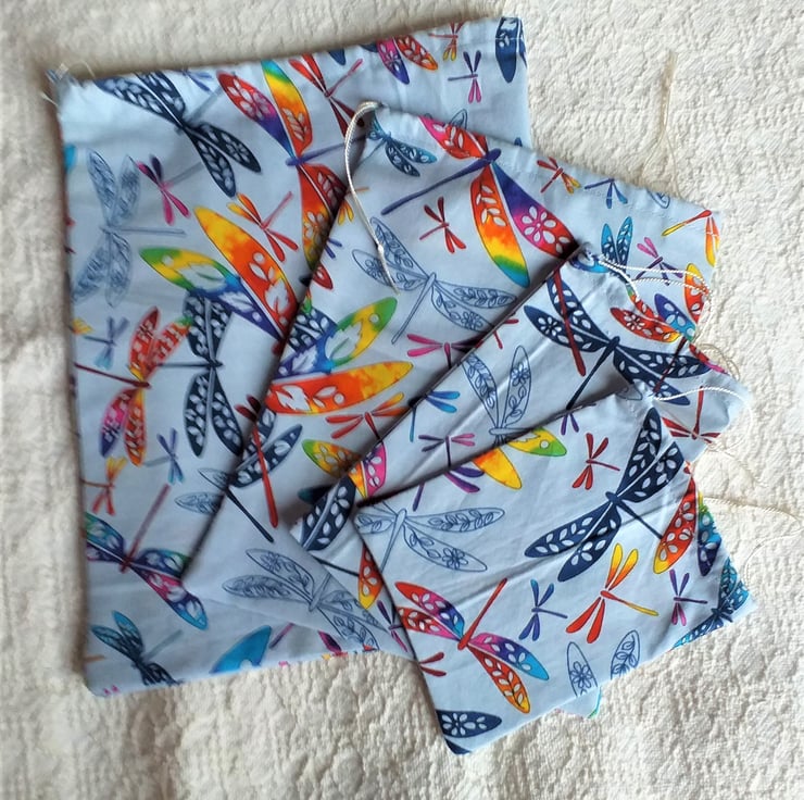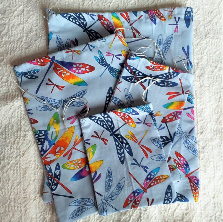 Make your gifts look even more special with this set of four fun cotton drawstring bags, the largest of which measures approximately 11" x 8.5" (28cm.x 22cm.). Multicoloured dragonflies flutter against the light blue-grey background. The bags are machine washable and re-usable.