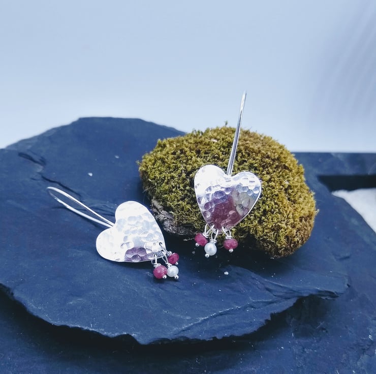 Everyone deserves a little love and these hammered Silver Hearts do just that. Each is accented with a delicate freshwater Pearl and two Rubies. They hand approximately 40mm in length and are about 15mm wide