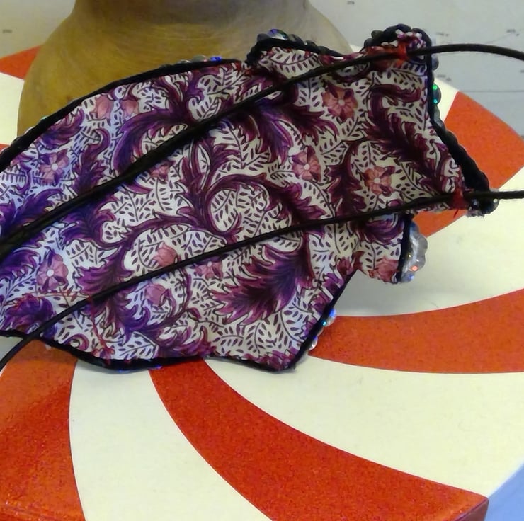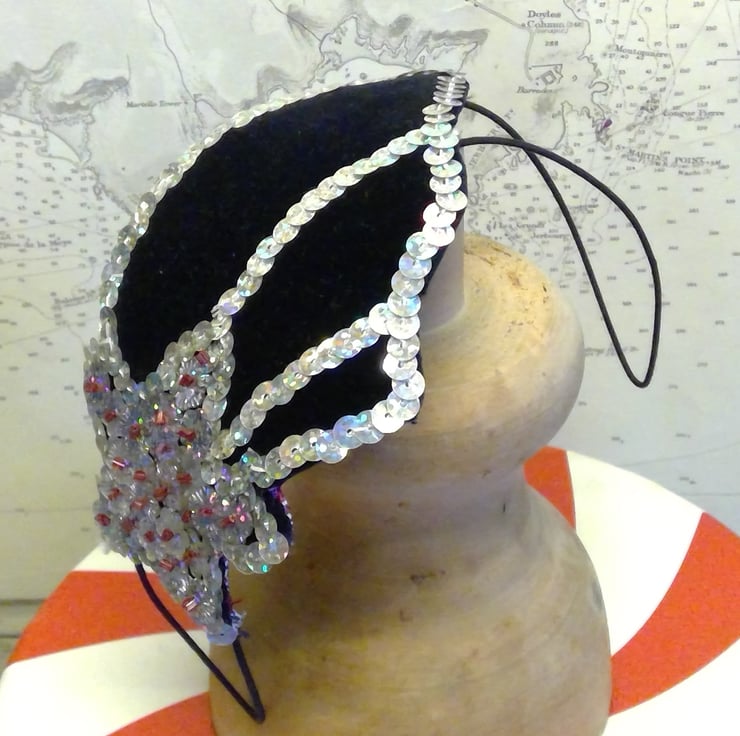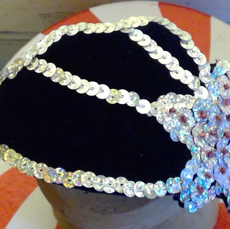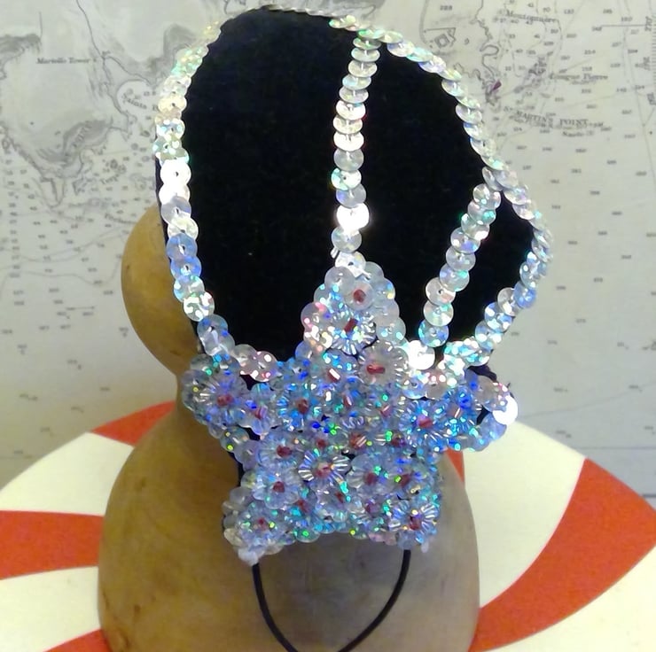 Sequin star burst head piece / fascinator. Couture made and a one off. Navy blue cotton base with silver sequin star burst with red beaded highlights. Piece is lined in purple paisley Liberty cotton print fabric. Measures 15cm from tip of star to end of star burst along head band and 9cm at widest part. On a wire headband to ensure easy wear. Equally stunning with short or long hair.