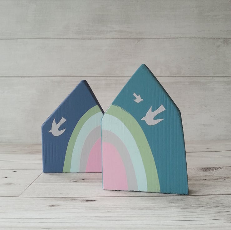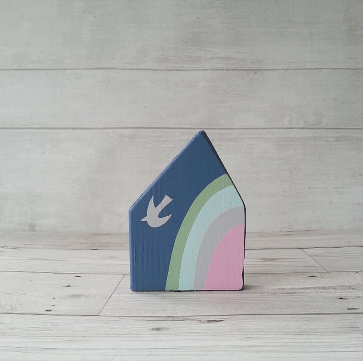 This one of a kind little wooden house is made from reclaimed wood, painted navy and screen-printed by hand in layers of pale pink, sage green, grey and duck egg blue. The back of the house is blank, and it has a slightly rustic/distressed finish.