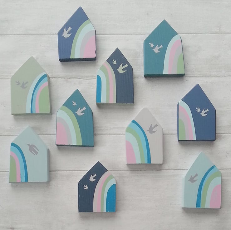 I moved to the countryside in 2019 and had been building up a stash of wood offcuts from other projects, intending to use them for firewood for the coming winter; realising that a lot of this wood was high quality pine which was too good to burn, I came up with the idea of using it to make little houses (a shape which is relatively easy to cut with limited woodworking skills/equipment). As it turns out, little houses are not only en vogue but they are the perfect canvas for experimenting with colour and pattern!