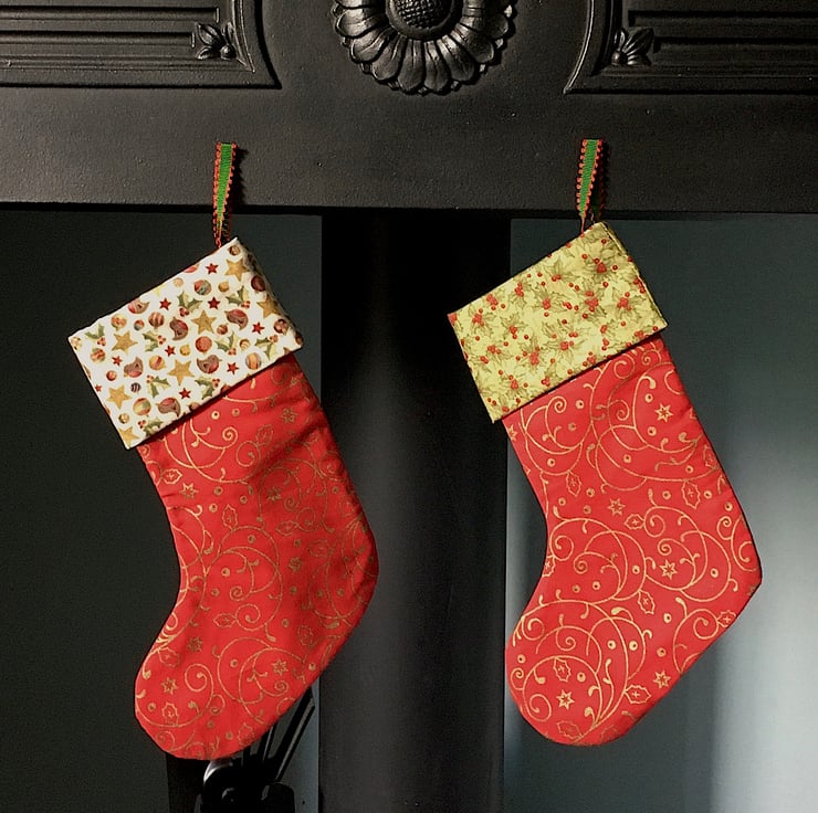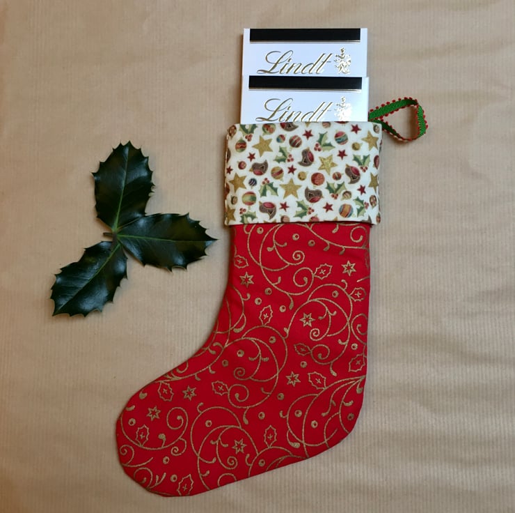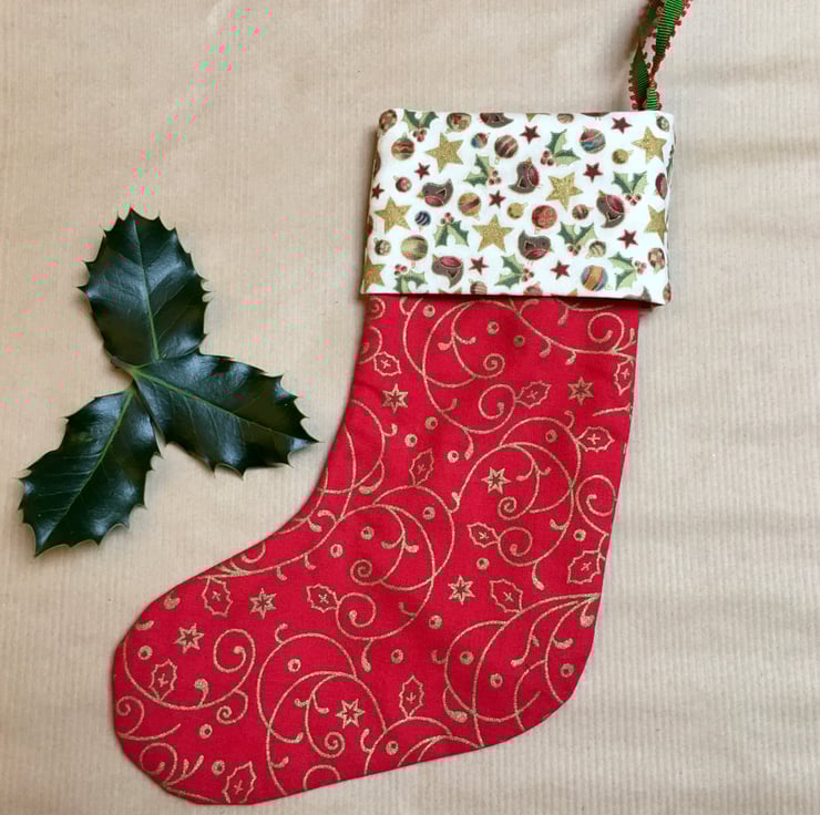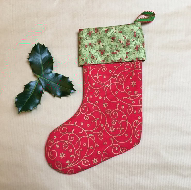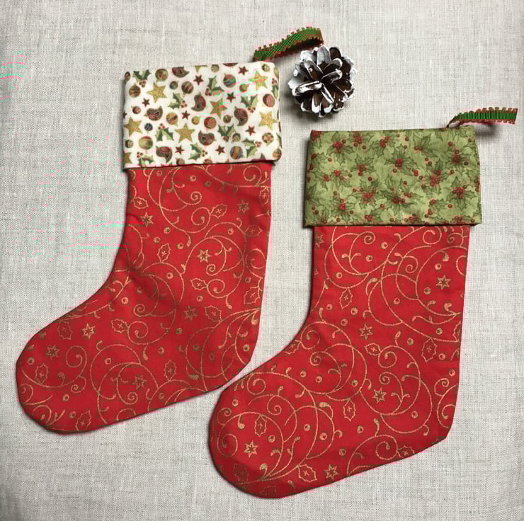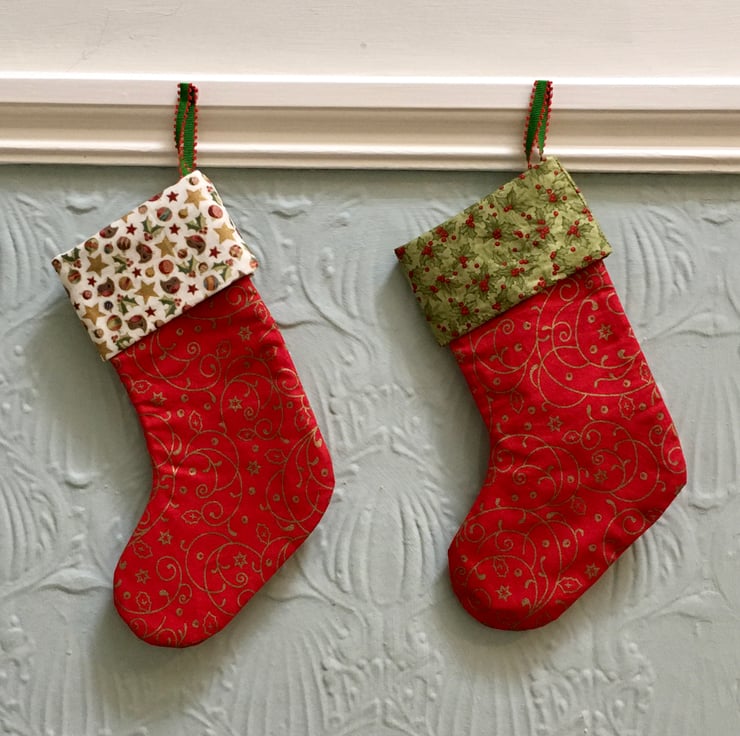 These vibrant handmade Christmas stockings are made from red and gold cotton fabric with gold swirls and a trim in a contrasting green mistletoe or robin, star and mistletoe fabric.