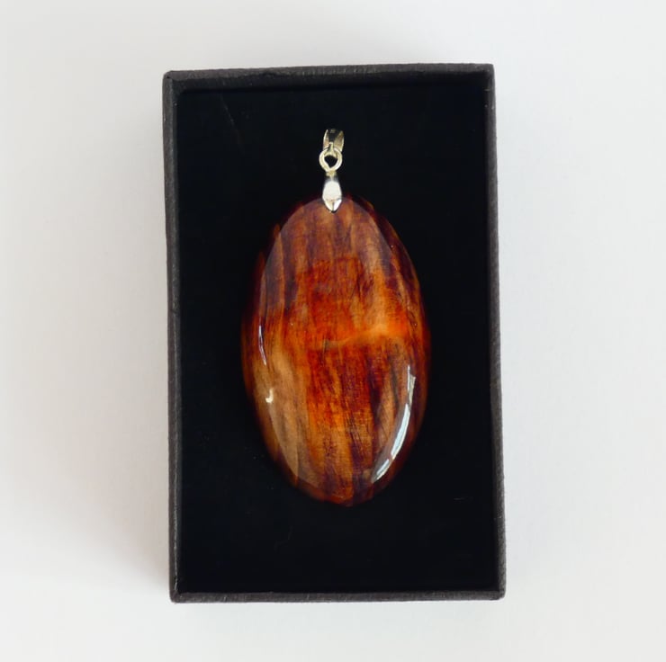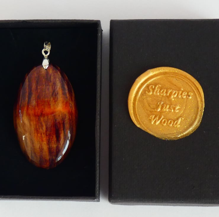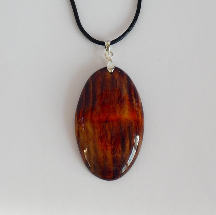 This pendant was cut and shaped from a piece of wood before being sanded to a smooth finish. The wood stain was added one colour at a time and was lightly sanded between each colour to enable me to leave enough of any particular colour to achieve the desired result. It is smooth to the touch and has been finished with several coats of Lacquer to enhance the grain whilst also protecting the pendant.