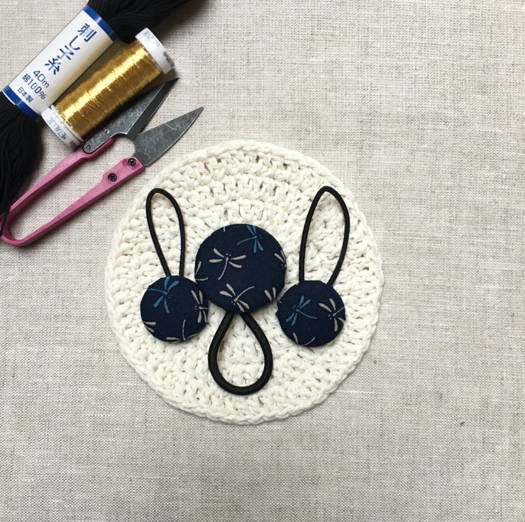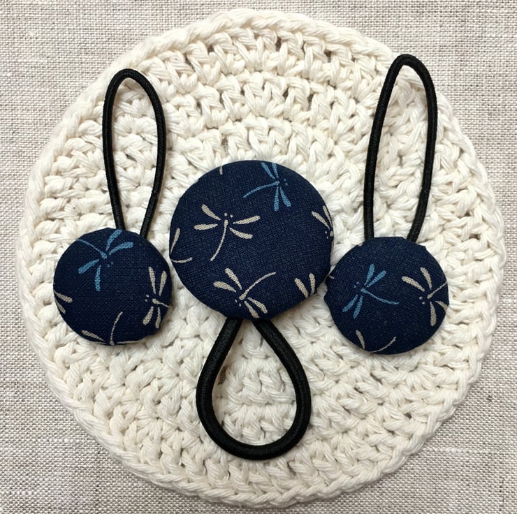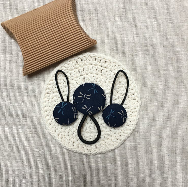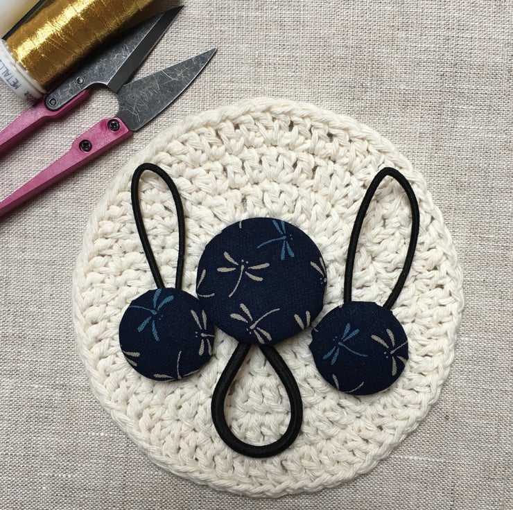The hair ties have been constructed using a metal button which has been covered in fabric by myself and a hair tie added.
