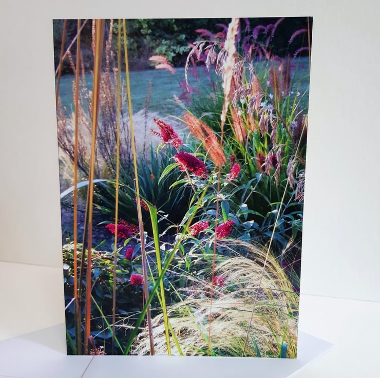 This photo captures the beautiful lighting and peaceful atmosphere of a summer evening in the garden - perfect for a range of occasions.