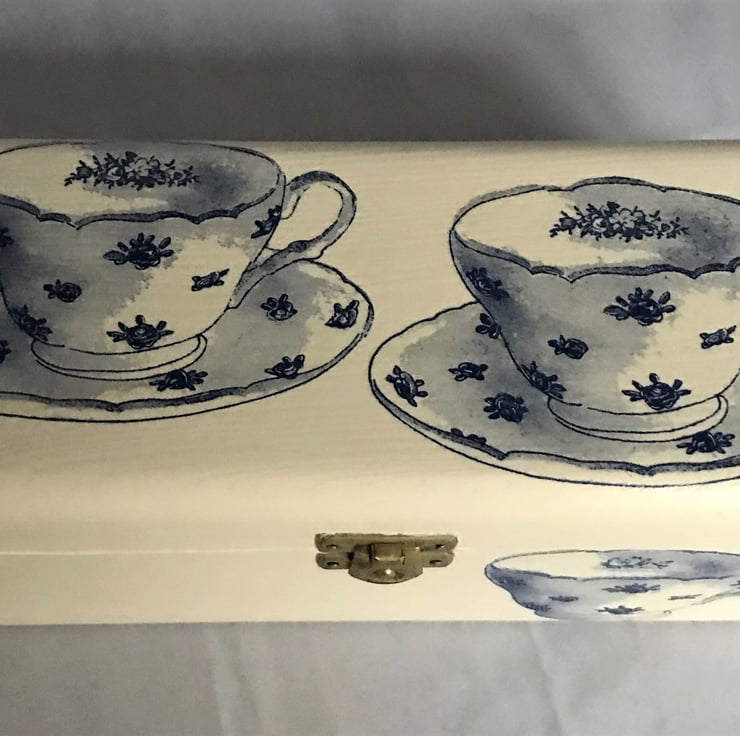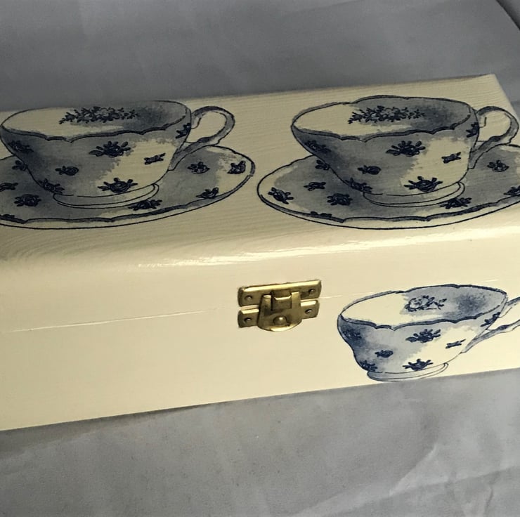 This three-section tea box has been painted all over white and then decorated with charming paper napkin images of blue vintage cups and saucers.