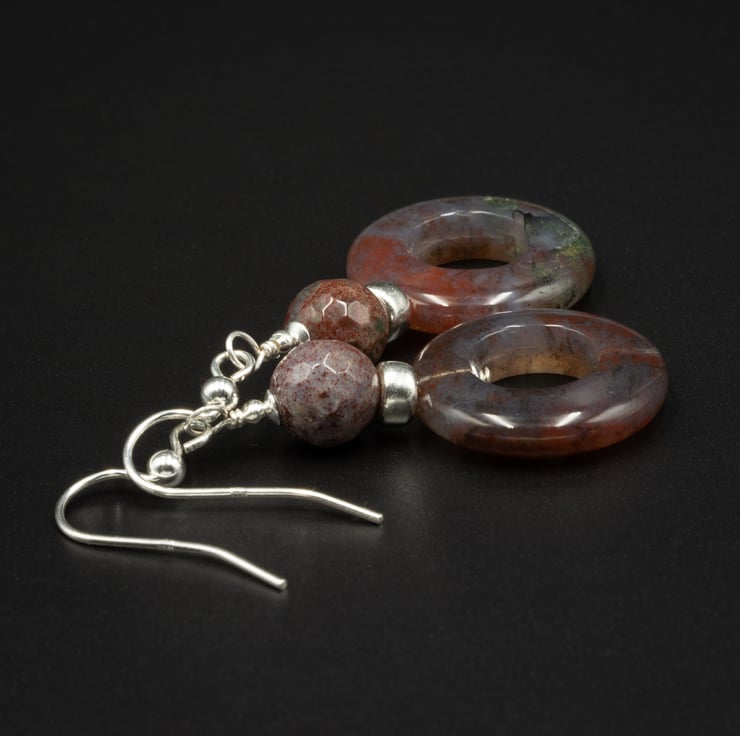 The hoops measure 20mm across and 5mm wide. They are topped with a silver plated disc and a toning 8mm faceted Indian agate bead. Ear wires are sterling silver sturdy hooks.
