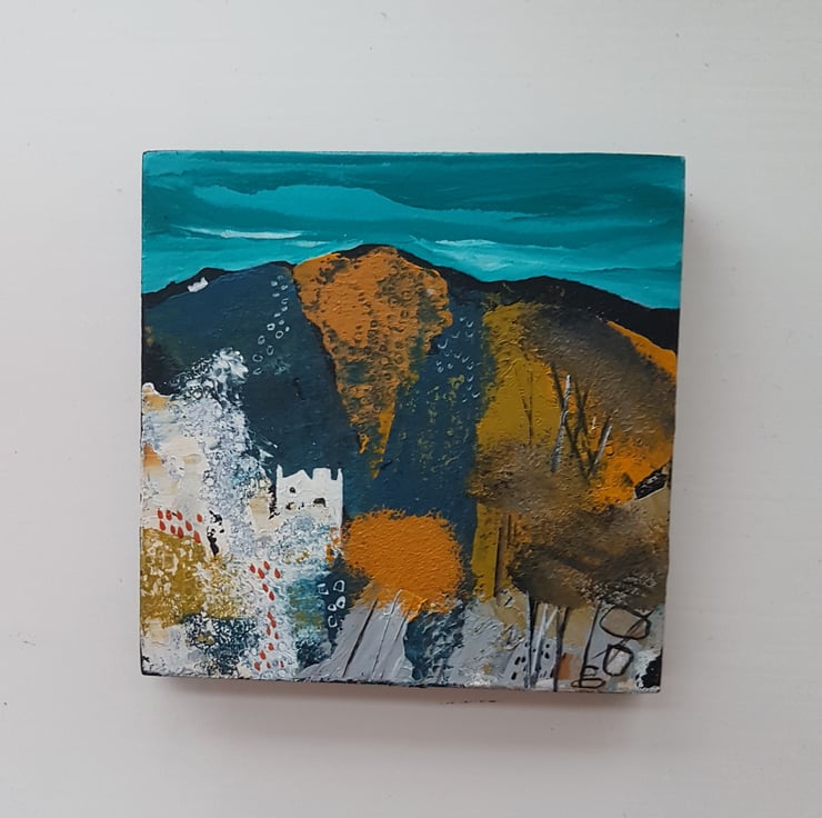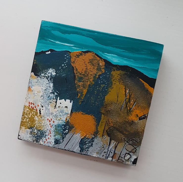 This 10 x 10 cm painting (1st image) is varnished signed on the back and has a hook ready to hang. Great to brighten up a small corner or to give as a gift.