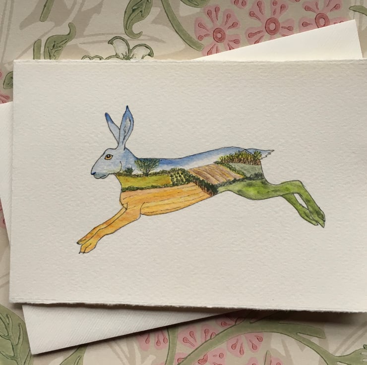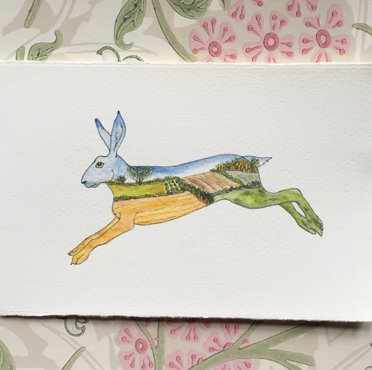 This is a hand painted watercolour on Fabriano card, of a landscape in a hare silhouette.