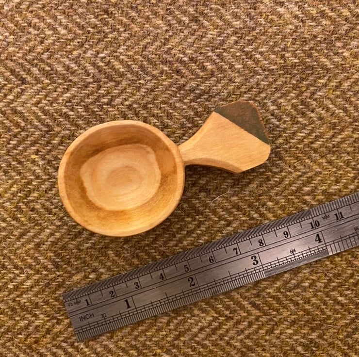 The scoop has been made from a freshly cut log, which was taken to its final shape using traditional methods- splitting the log firstly into a 'blank' using a froe tool, drawing on a rough shape before axing this out and then finalising the shape using an array of knives. This leaves beautiful cut facets which mean no sanding is required. After drying, the scoop receives a final shaping by knife, before the handle is painted using food safe milk paint and a small makers mark is burned on. The scoop is then burnished using a smooth Scottish pebble leaving a silky feeling to the wood. And finally the wood is sealed using organic food grade linseed oil.