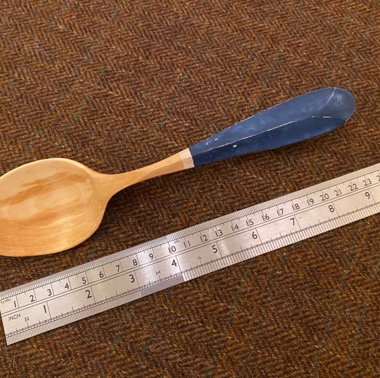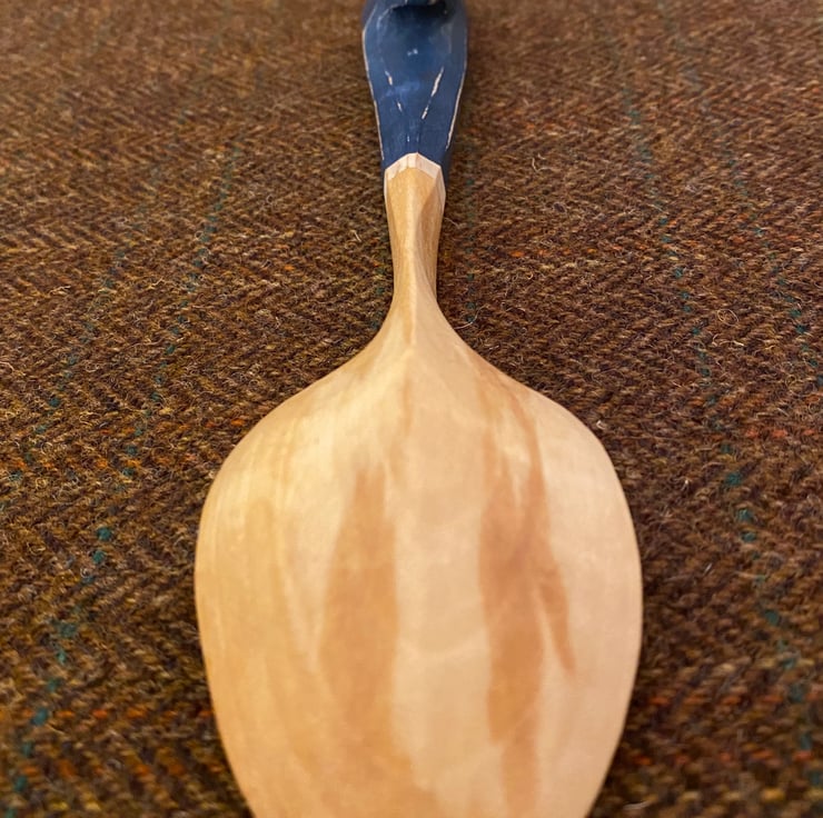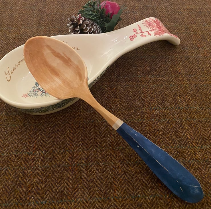 A curvy Birch wood serving spoon with a deep bowl, and a hook for hanging the spoon on the side of a bowl/pot or kitchen utensil bar. The spoon has a lovely deep keel allowing a narrow but strong neck. The handle has been painted in a deep blue over a base of cream to contrast the light birch wood. Burnishing the spoon allows the underlying cream colour to peek through. Perfect for serving your favourite dinner and can also be used for cooking/stirring duties too!