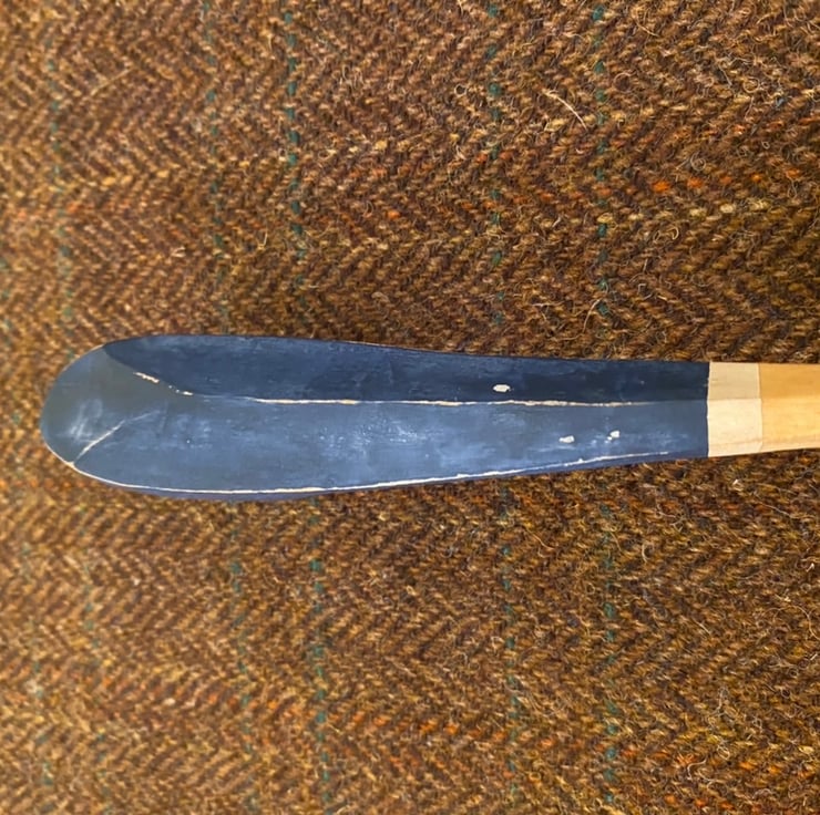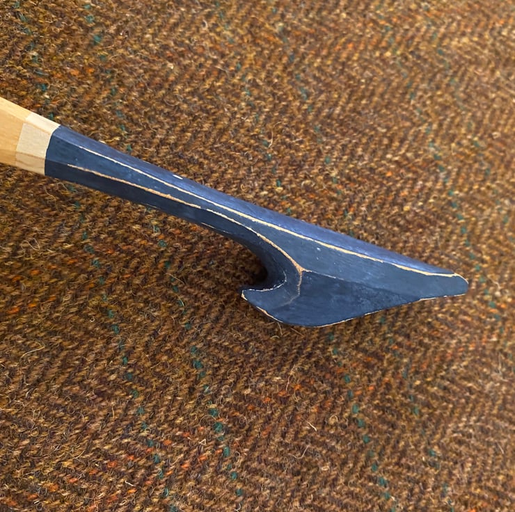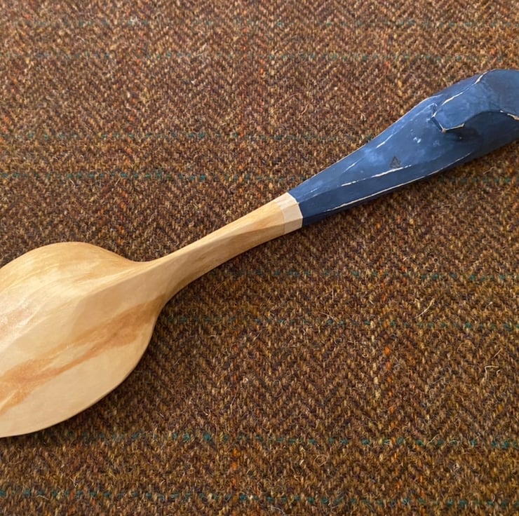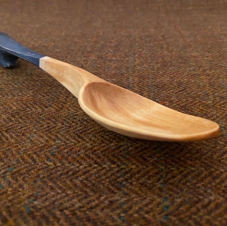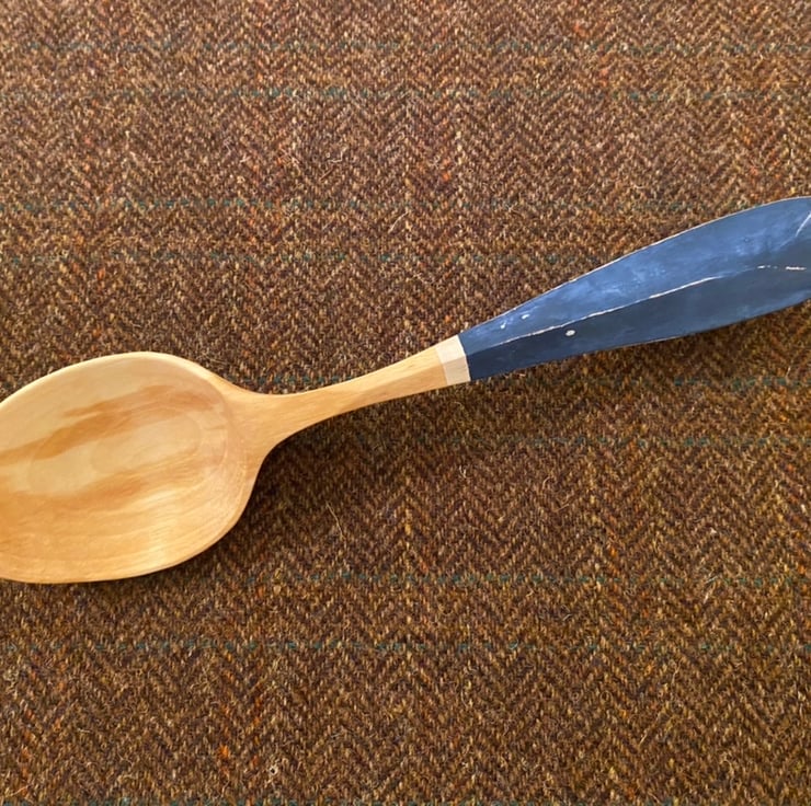 This spoon has been made using traditional methods splitting the material out from a fresh sawn log, sourced from a local tree surgeon. A rough shape for the spoon is then axed out, before moving onto a variety of knives to hone the shape. Once dry, the spoon has then been given two coats of food-safe milk paint to the handle area, followed by burning in my makers mark. The spoon has then been burnished with a scottish pebble and sealed using organic food grade linseed oil.