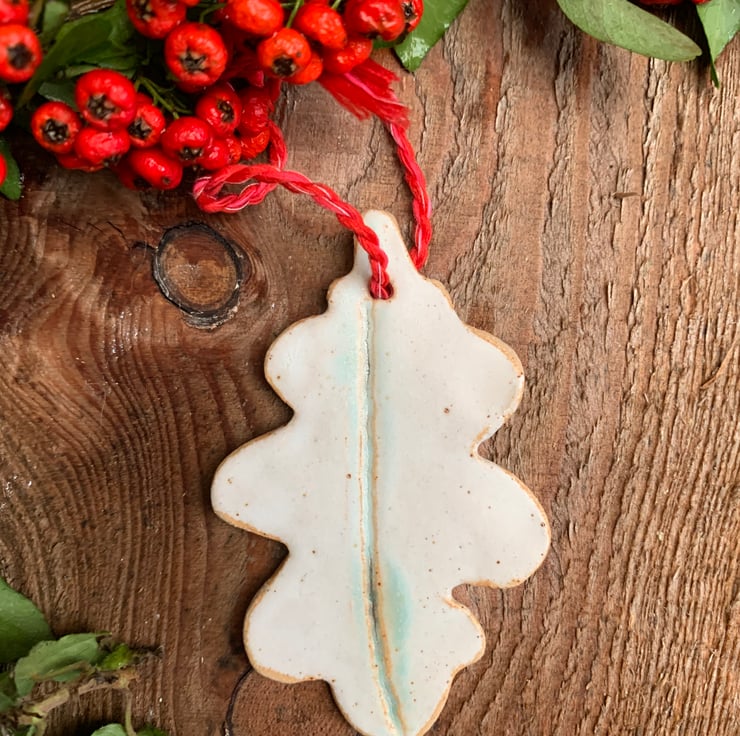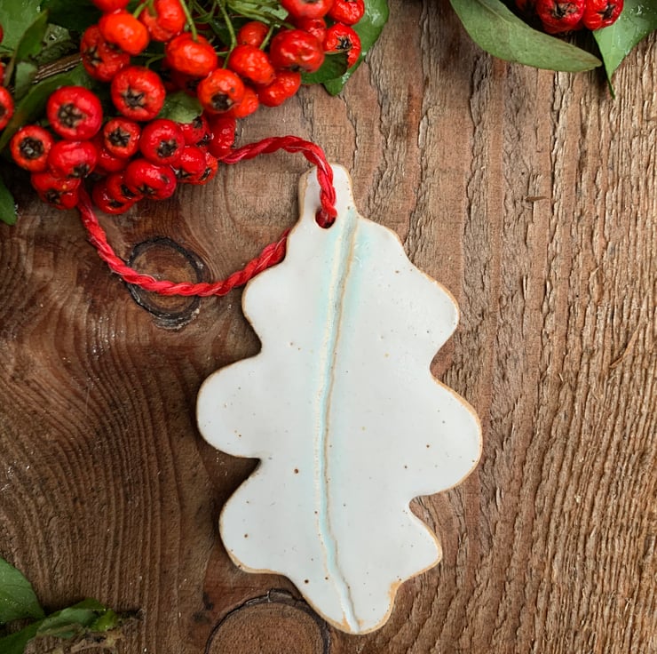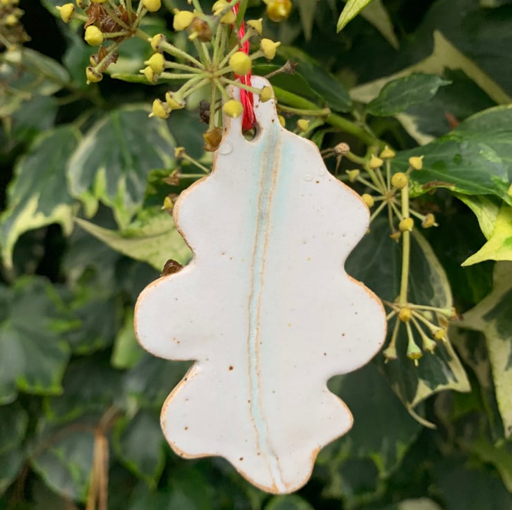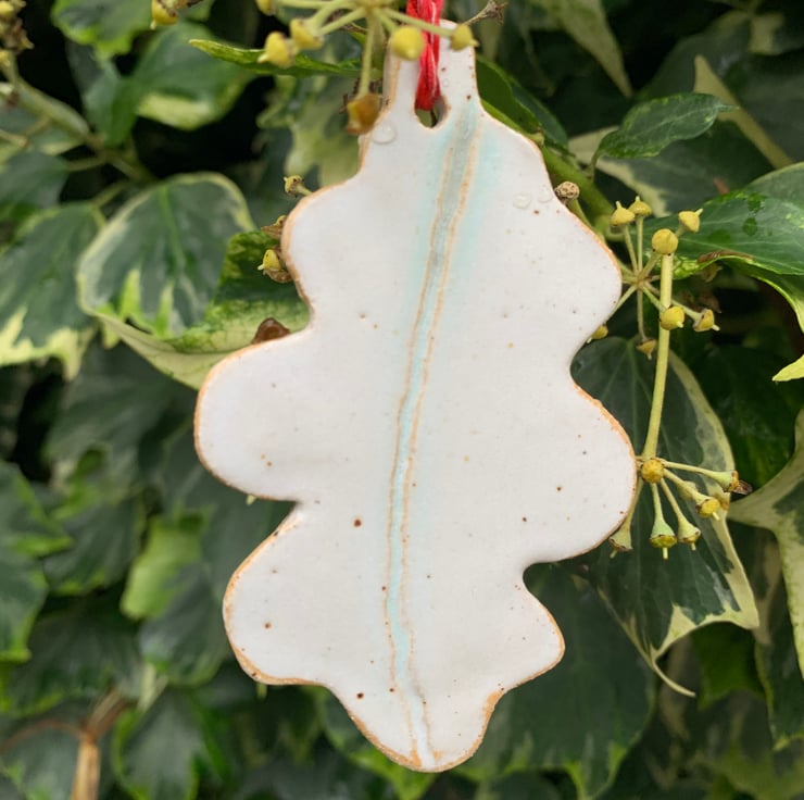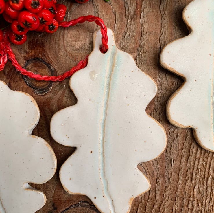 These stoneware leaves have been cut by hand from a rolled slab of clay. I use templates which I have created myself to cut around. Once the leaves have firmed up slightly I refine the edges and make a hole in them, so they can have a cord strung through them.