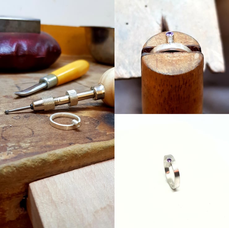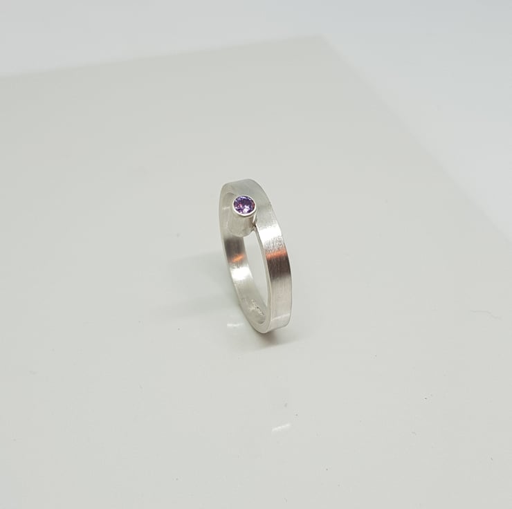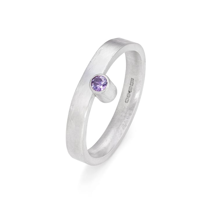 A simple sterling silver ring with a tiny amethyst in a tube setting.
