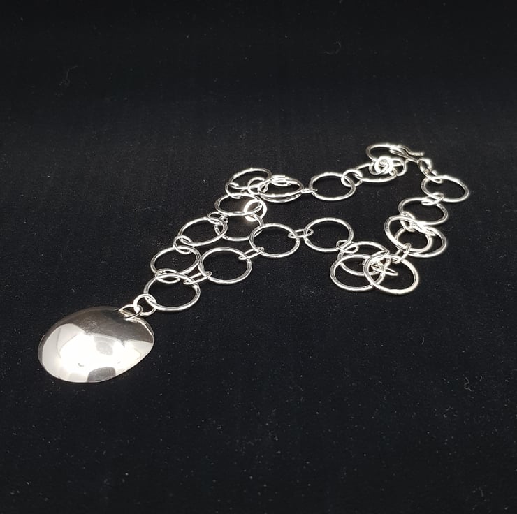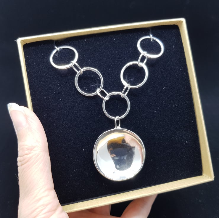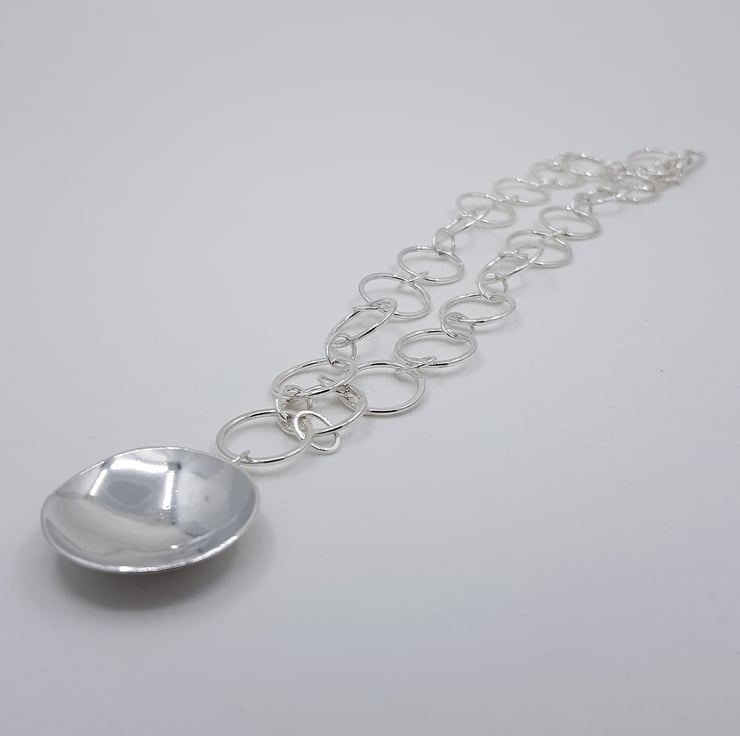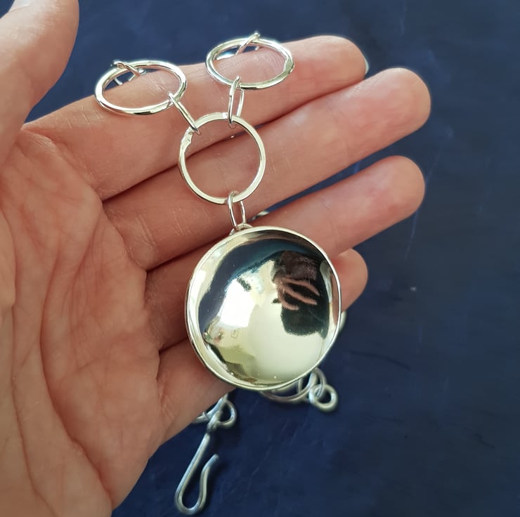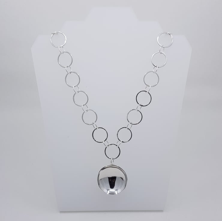 This stunning statement necklace is part of my 'Planet & Moon' inspired collection. It features a large hand shaped concaved dome 'planet' which hangs from a hand forged chain. It has been made from hallmarked sterling silver, and is one of my original designs.