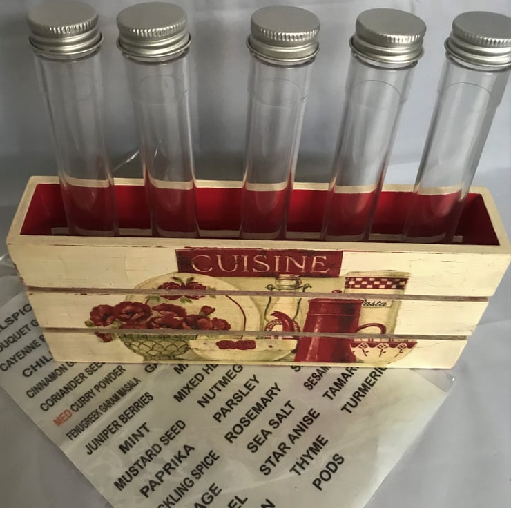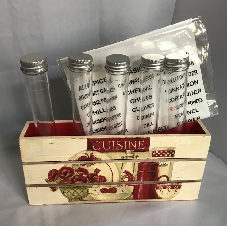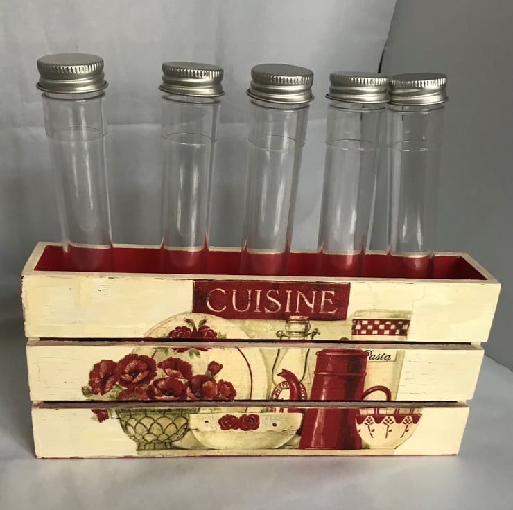 This is an unusual and vintage/rustic-look herb rack, with a decorated crate-type box holding five plastic see-through tubes with screw tops, for storing various herbs and spices. Or it might also be used to display a selection of pretty flower stems.