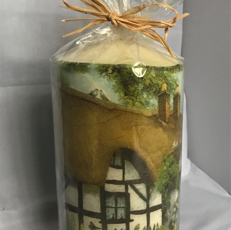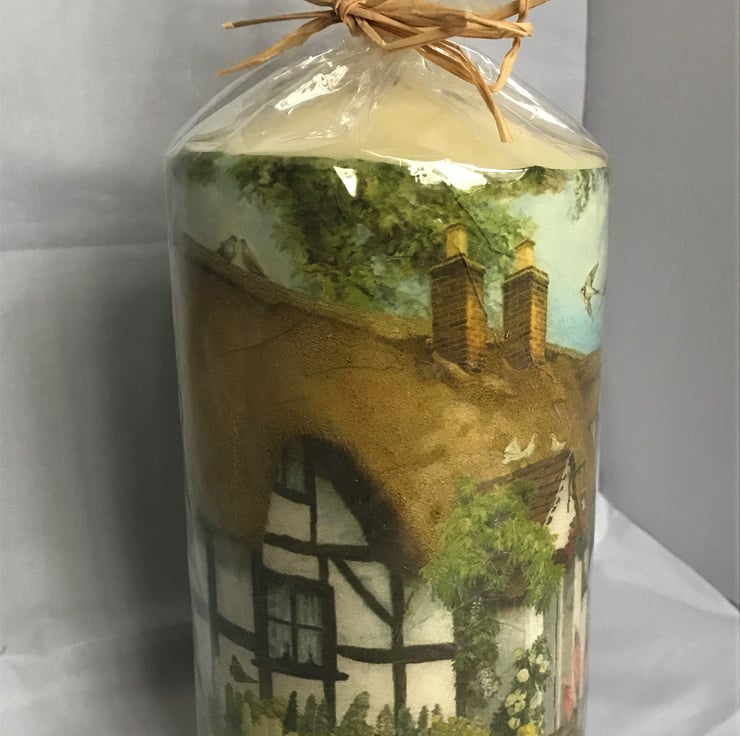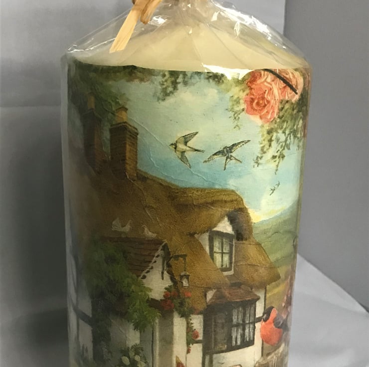 This large unscented cream candle is decorated with a beautiful napkin image of a thatched country cottage in Summer, with blossom, flowers, and birds around it, which is ‘wrapped around’ the candle. There is even a dear little dog on the front path.