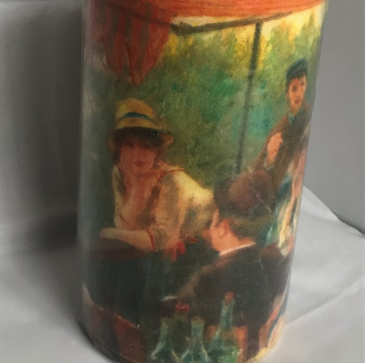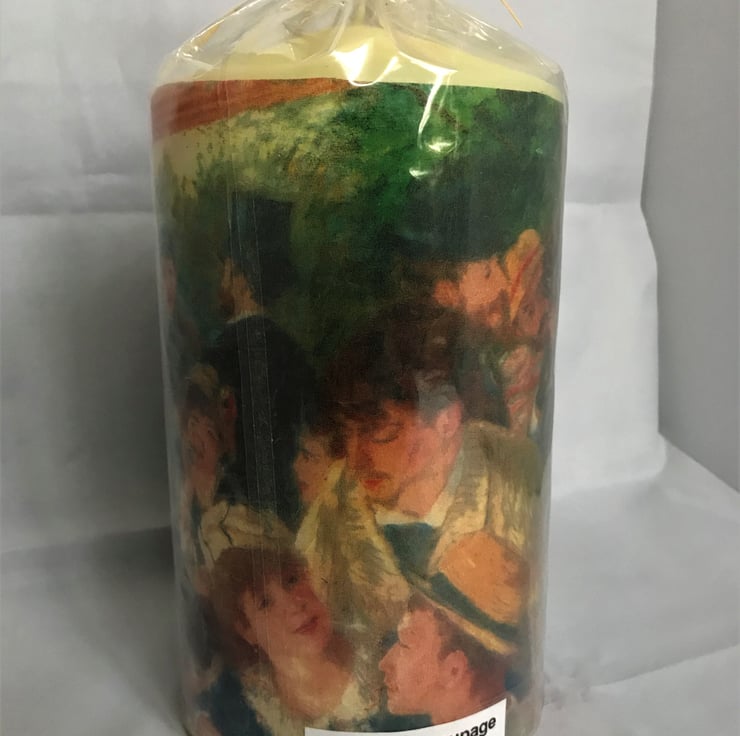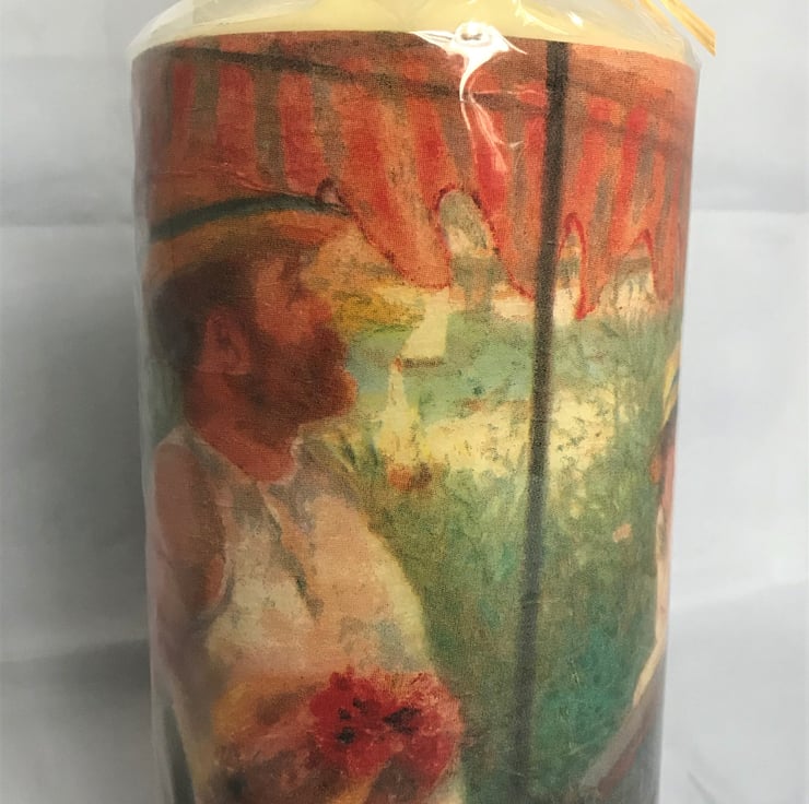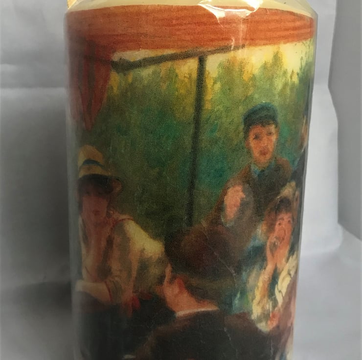 This large unscented cream candle is decorated with an unusual napkin image of part of the Boating Party painting (Renoir) - with some of the various characters that it contains - ‘wrapped around’ the candle.