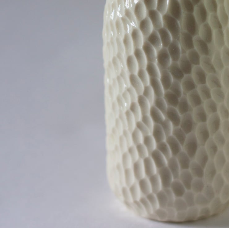 The porcelain is stained a very pale buttery cream and carved with texture. The exterior is glazed with a semi clear glaze that has settled into the carvings. All the vases are glazed on the inside to make them easier to keep clean.