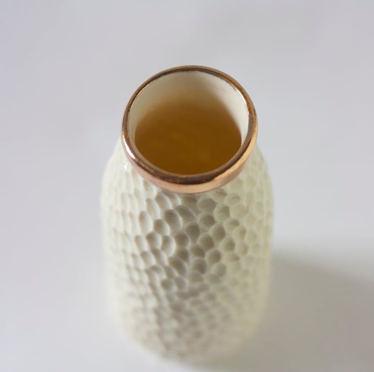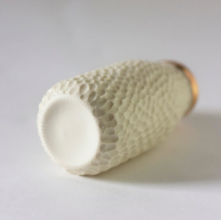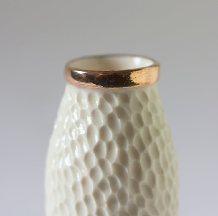 Each vase is individually carved to create the markings in the porcelain. These carvings make each individual vase unique. Gold lustre is applied to the rim and it is fired for a third time.