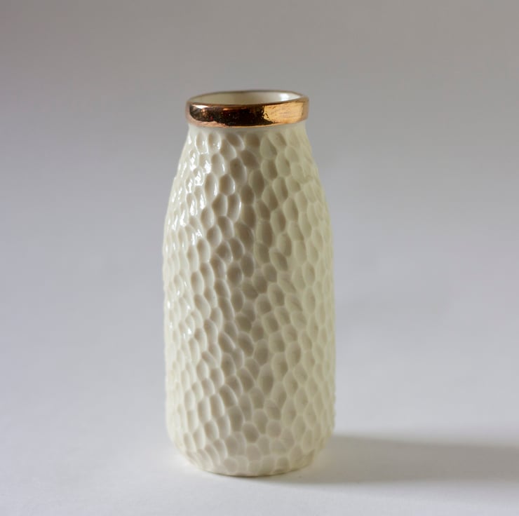 Small porcelain milk bottle vase, with a gold lustre rim, just like the gold top of yesteryear!