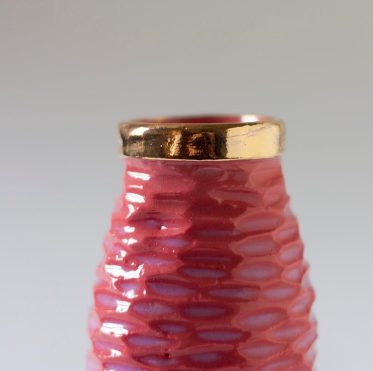 Each vase is individually carved to create the markings in the porcelain. These carvings make each individual vase unique. Gold lustre is applied to the rim and it is fired for a third time.