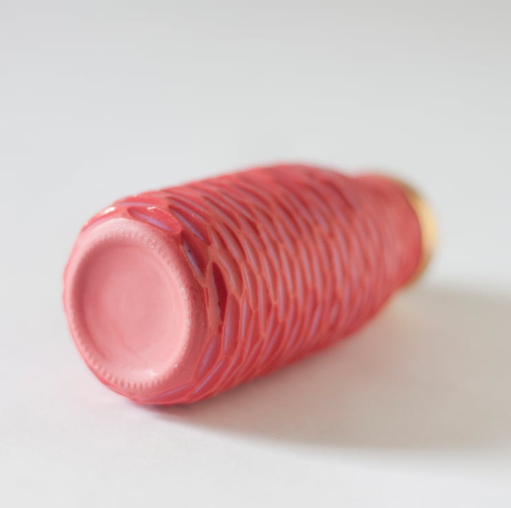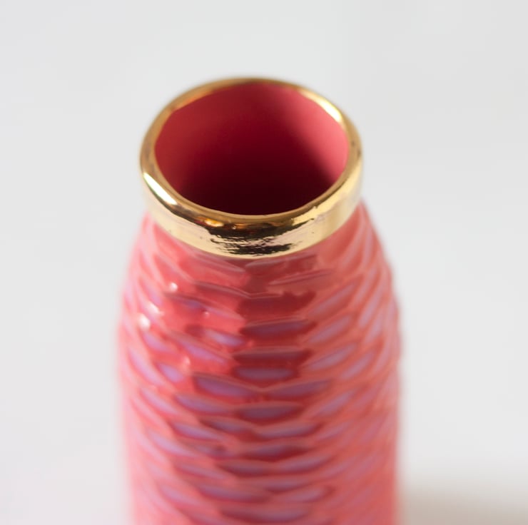 The porcelain is stained a pinkish coral colour and carved with texture. The exterior is glazed with a semi clear glaze that has settled into the carvings. All the vases are glazed on the inside to make them easier to keep clean.