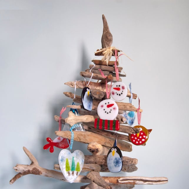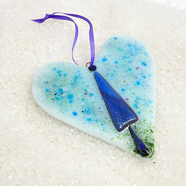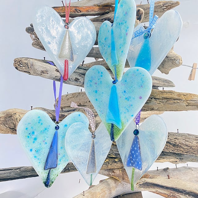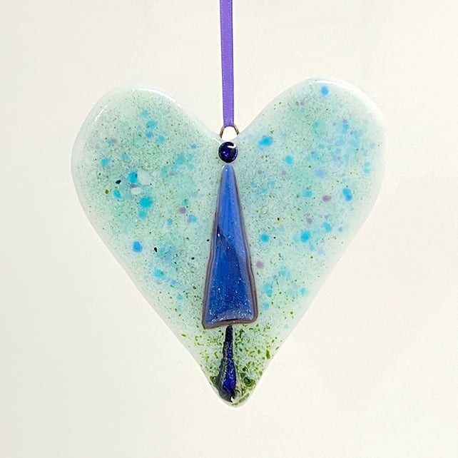 Created from layered Bullseye glass in my Whitstable workshop. This decoration has a gorgeous, wispy background and a sparkle finish. A little dichroic bauble tops off the purple tree.