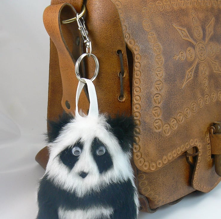 This little Panda coin purse is made from faux fur,it is cotton lined and has a zip closure with a keyring and lobster clasp to clip onto bag if wished. He has googly eyes.