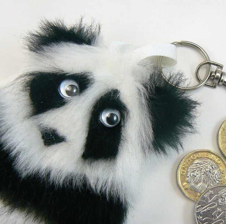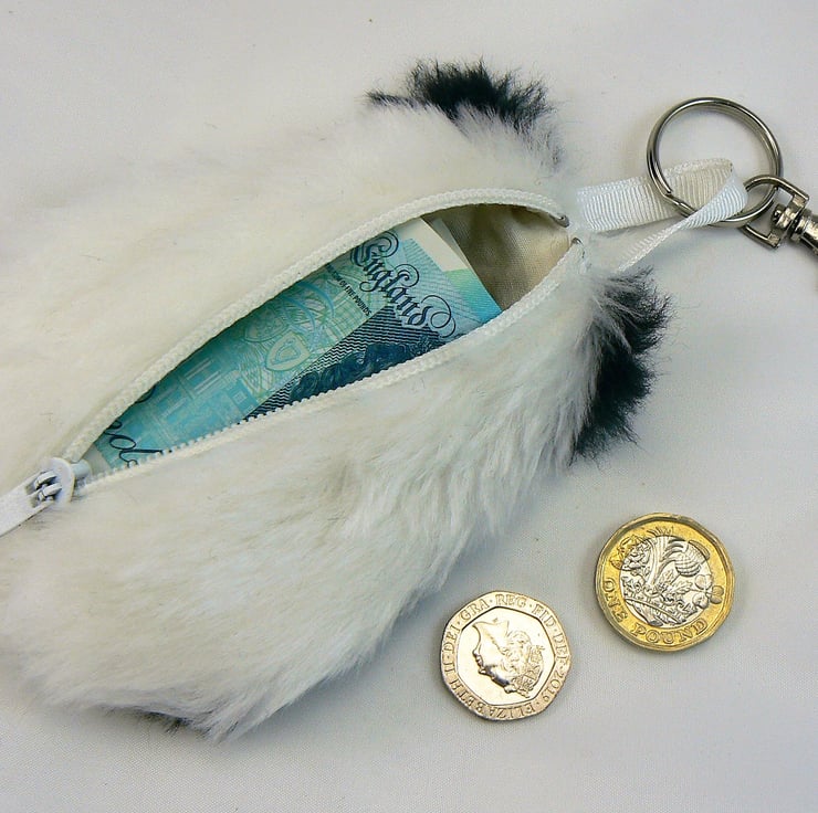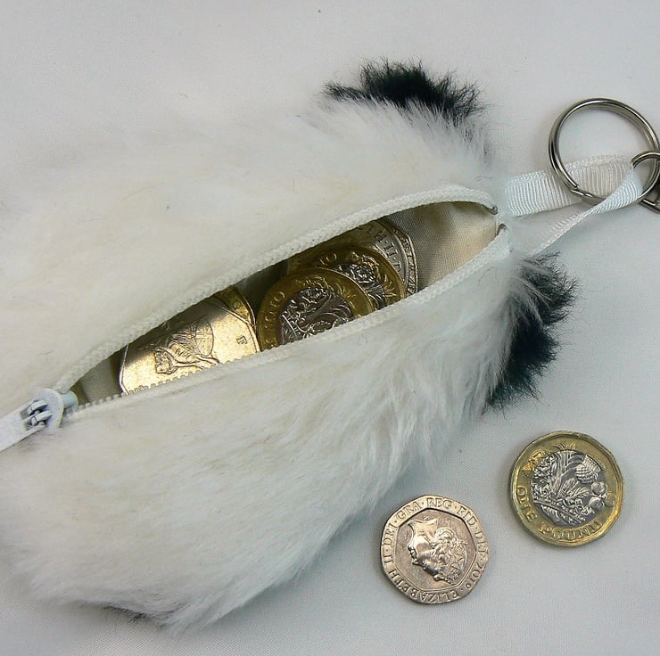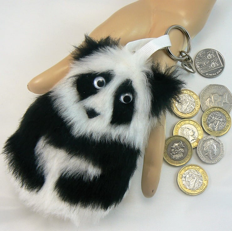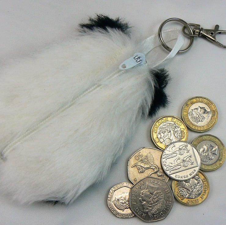This little Panda coin purse is made from faux fur,it is cotton lined and has a zip closure with a keyring and lobster clasp to clip onto bag if wished. He has googly eyes.