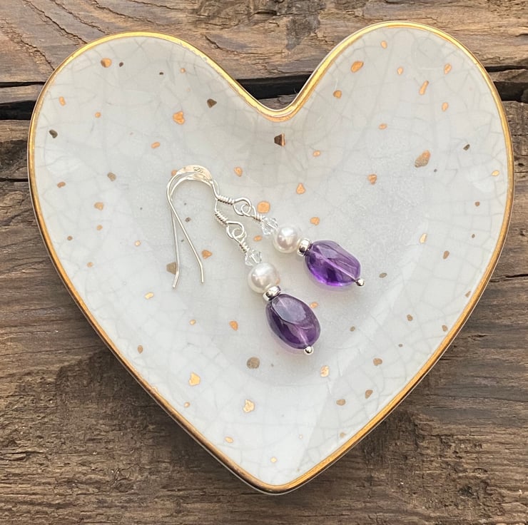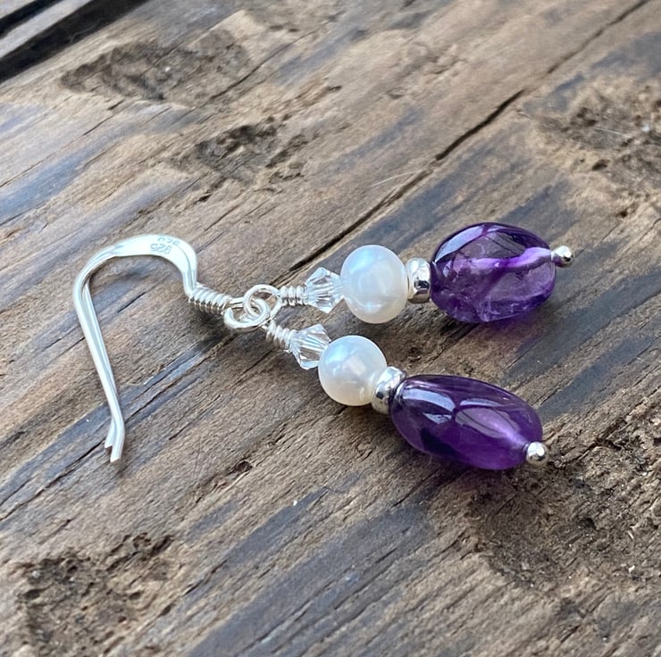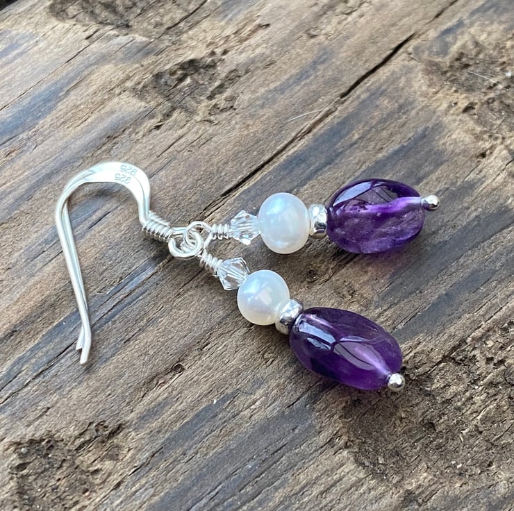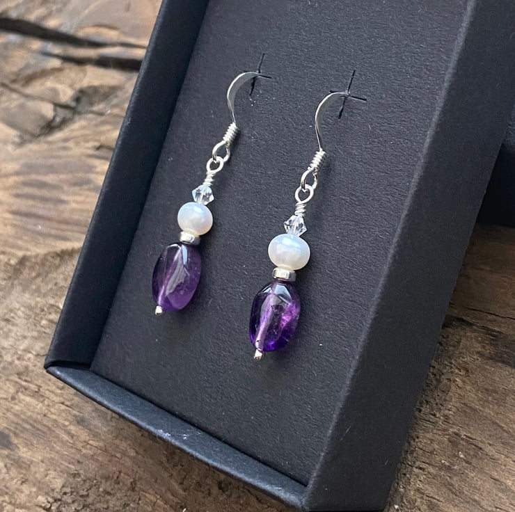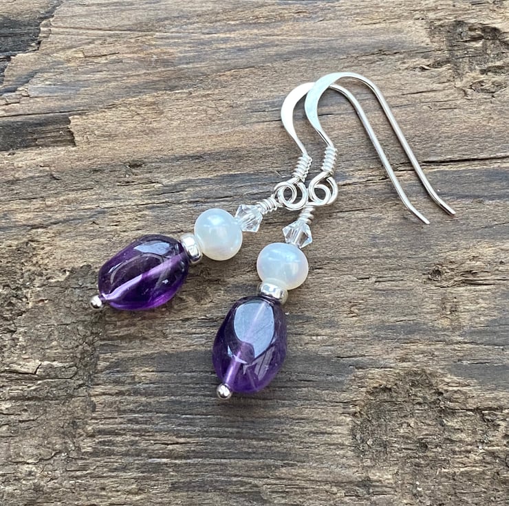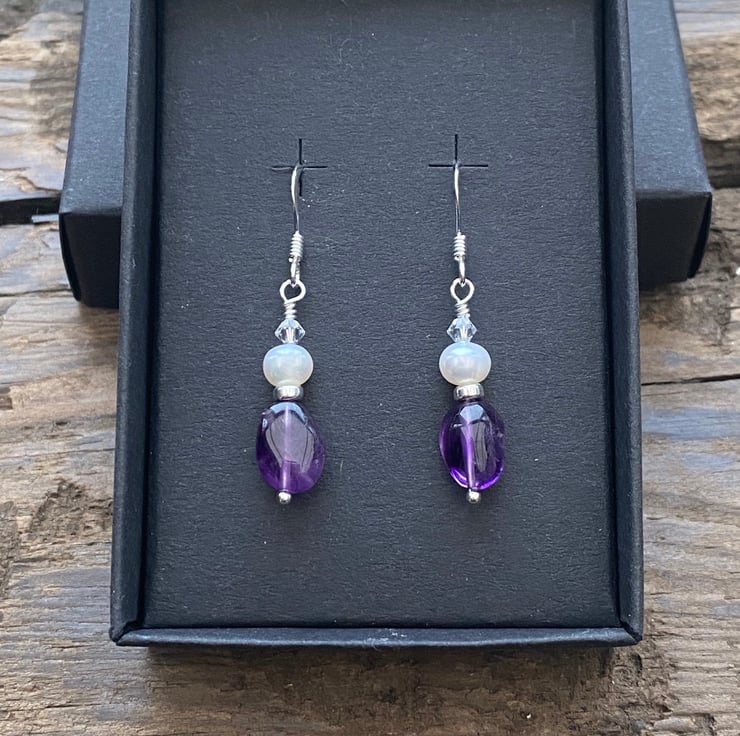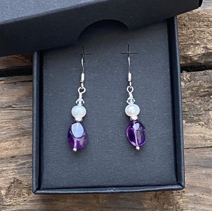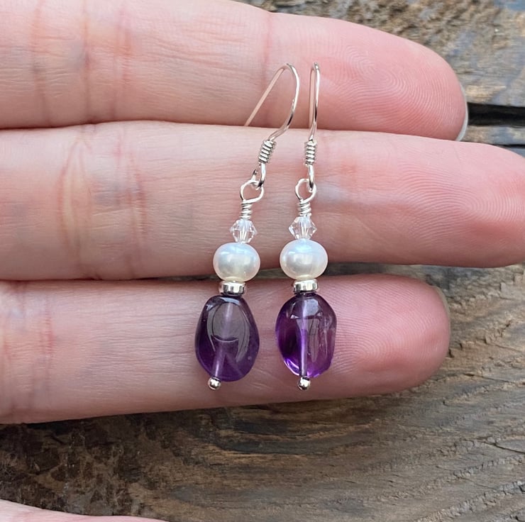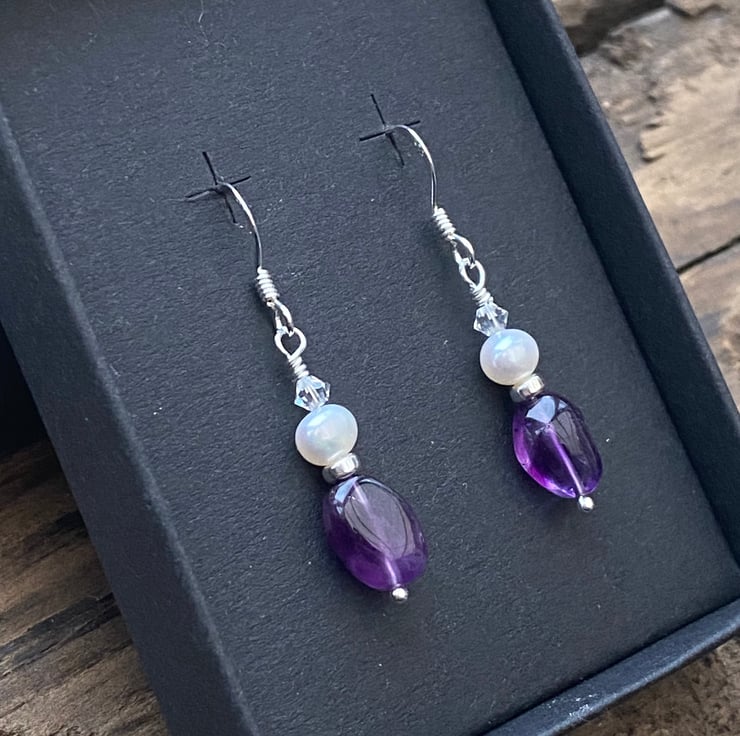 Stunning nuggets of Amethyst, Freshwater Pearl and a Swarovski Crystal have been hand wired onto a sterling silver headpin and separated with a sterling silver spacer bead, hung upon sterling silver earring wires.