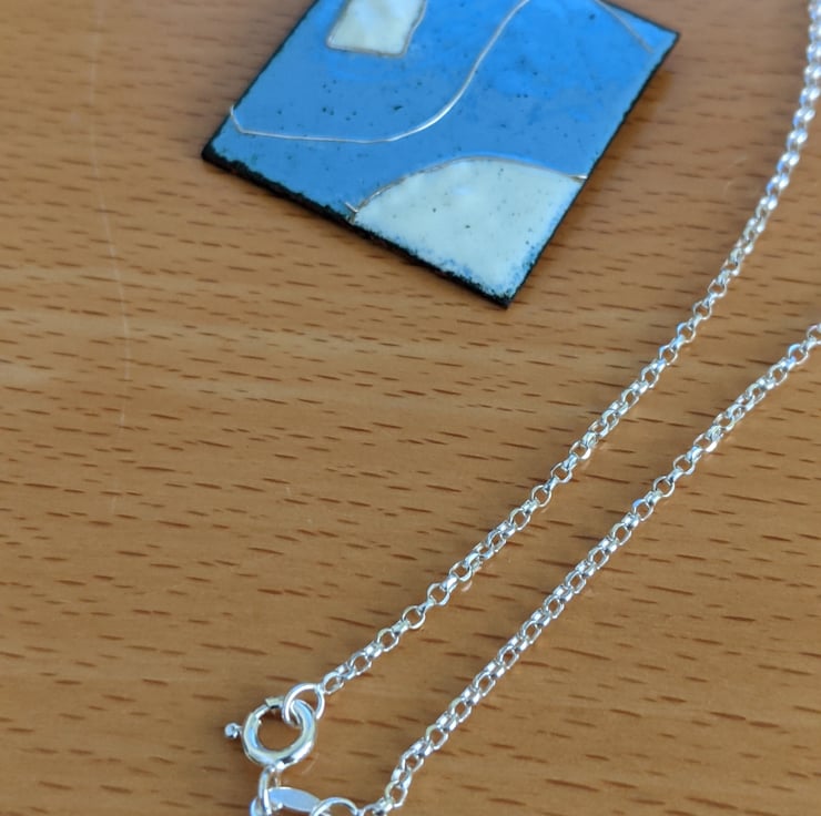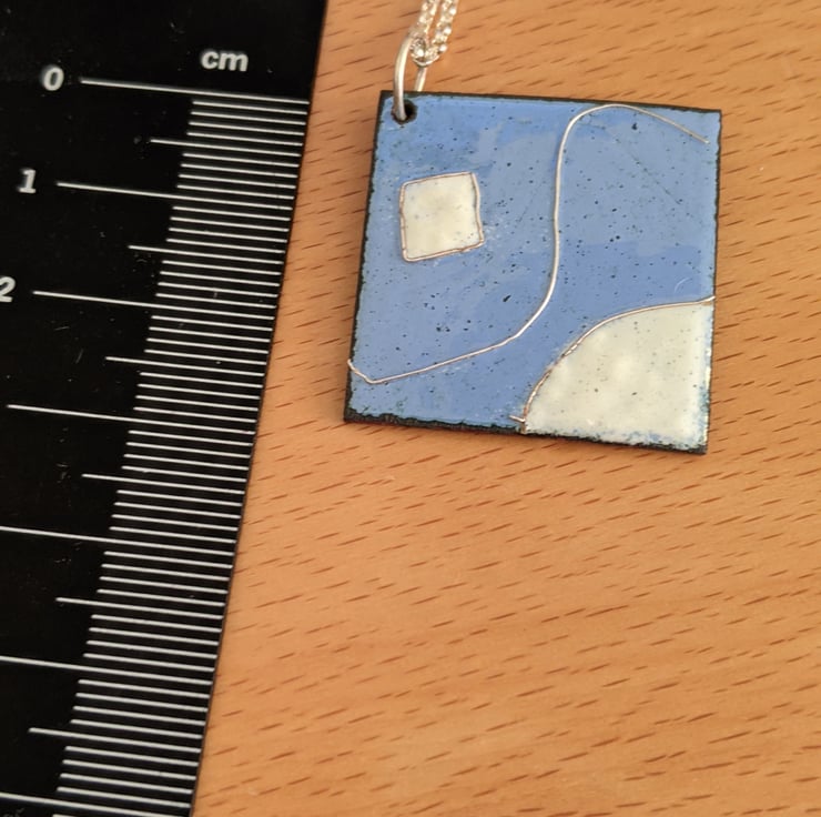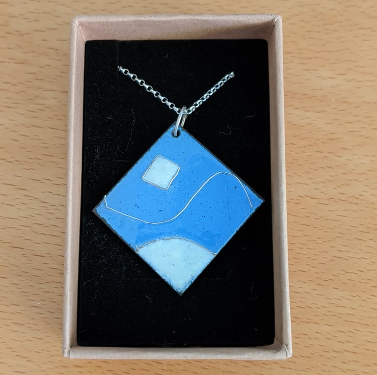 This enamelled pendant is made from vitreous enamel on copper base. It is of a white and blue abstract design with silver sunk into the enamel using cloisonné technique.