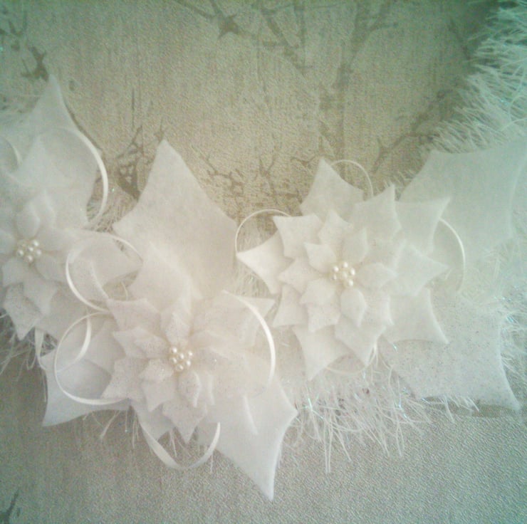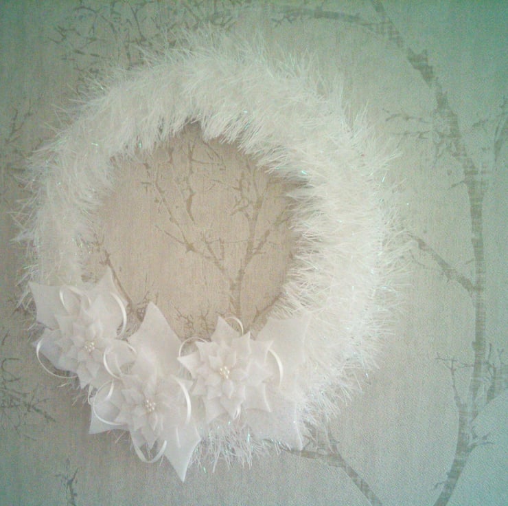 A completely handmade and unique wreath. Consisting of a copper wire base wrapped around with white glittery wool. Embellished with poinsettias die cut from white and white glittery felt. White ribbon and felt leaves. Finished off with pearl beads.