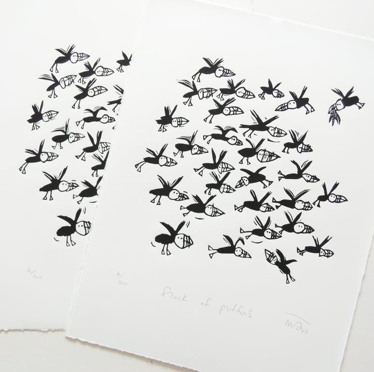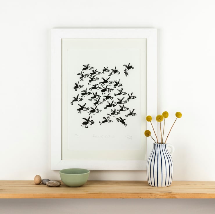 This lino print has been hand burnished from my original lino block onto Somerset Satin paper in a limited edition of 100 - each is titled, numbered and signed on the front. As they are hand made original prints there will be tiny variations on each Flock of Puffins lino print.