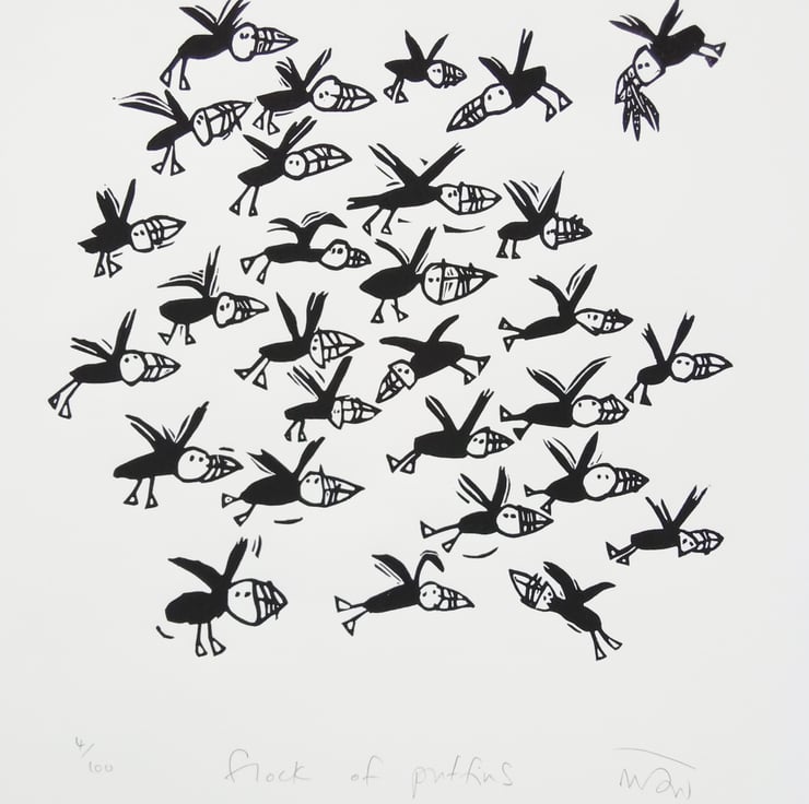 Flock of Puffins - lino cut print by Melanie Wickham