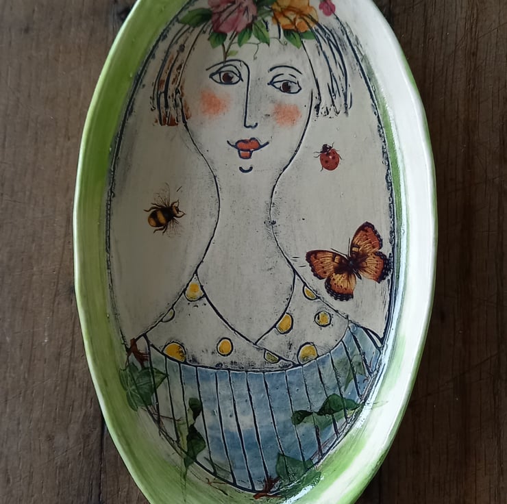 Pressed in white clay and painted with coloured slips and glazed in a matt clear glaze.Ceramic decals of flowers birds and insects are added to give details.Measures approximately 15cms .Hanging loop on reverse. Will be carefully packed and posted.