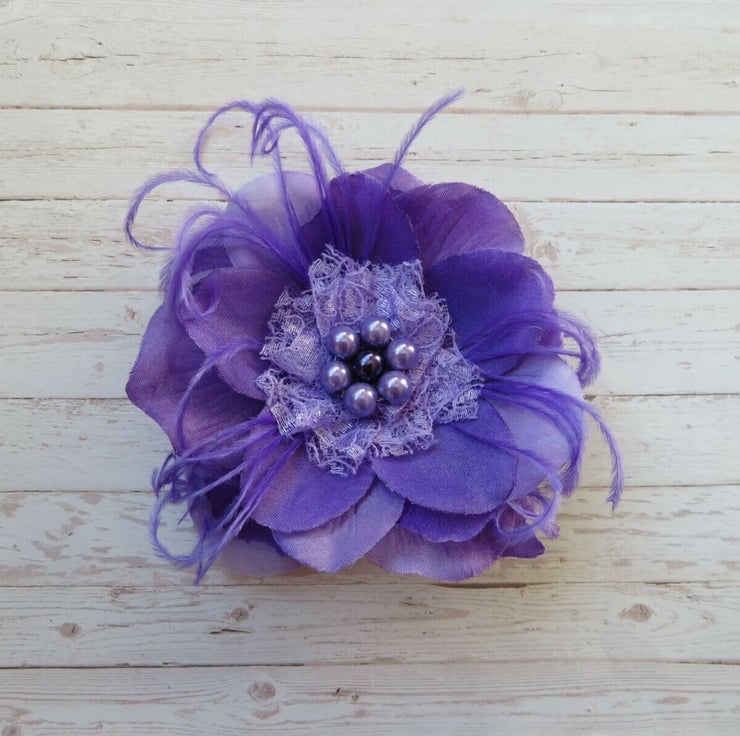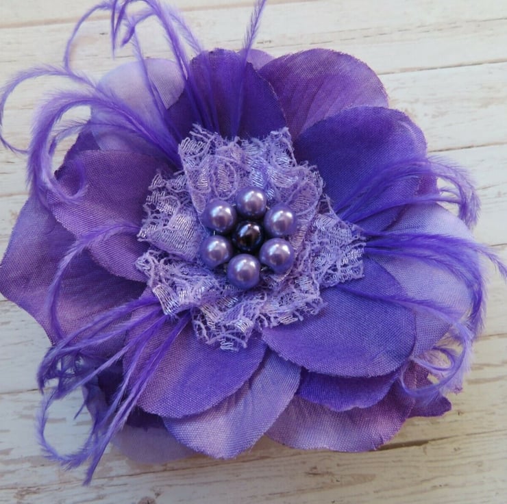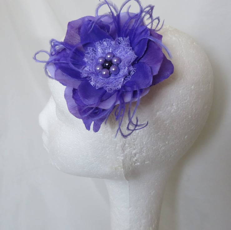 Made with a two tone fabric rose flower with ultraviolet ostrich feather fronds, a lilac lace ruffle and a cluster of dark lilac and purple pearls.