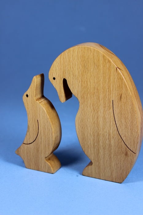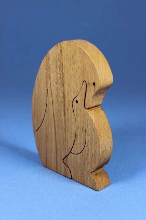 A beautiful free standing mother penguine & chick made from beech wood finished in a satin sheen. The fine grain structure of beech making it an ideal wood wood for puzzles.