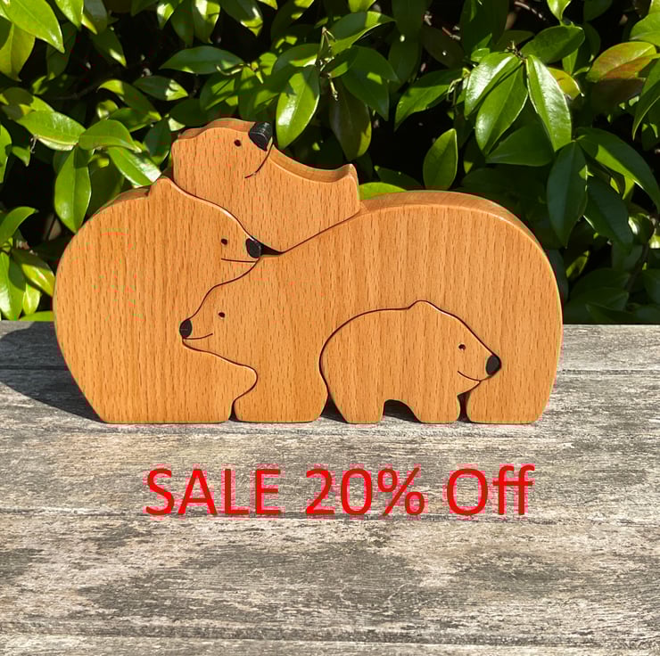 A very charming puzzle of a bear family made from beech wood. The puzzle which is freestanding makes a very attractive ornament. The handmade puzzle has been cut from a solid piece of beech wood, sanded smooth to avoid all sharp edges and corners to provid a very tactile surface. The puzzle is finished in multiple coates of danish oil providing a very durable light gloss finish.