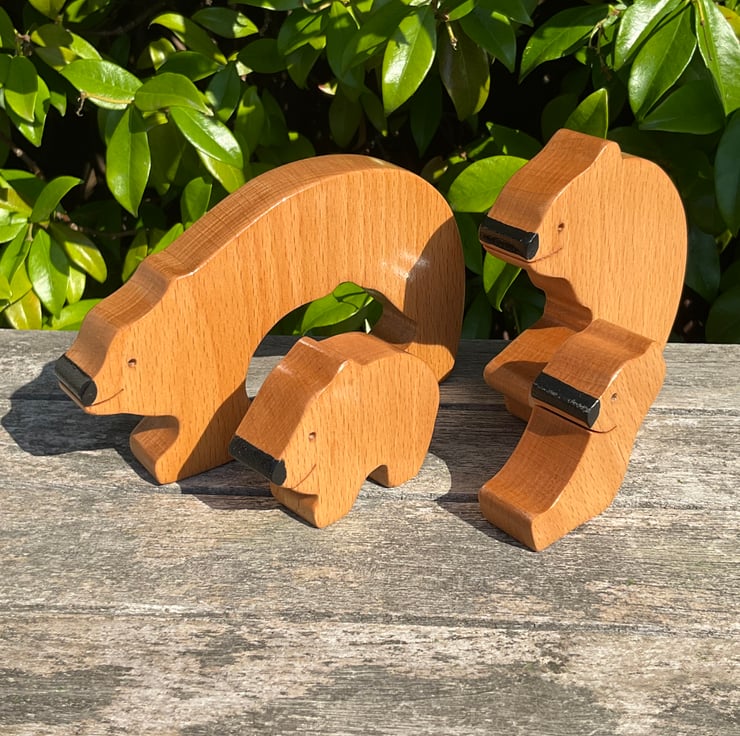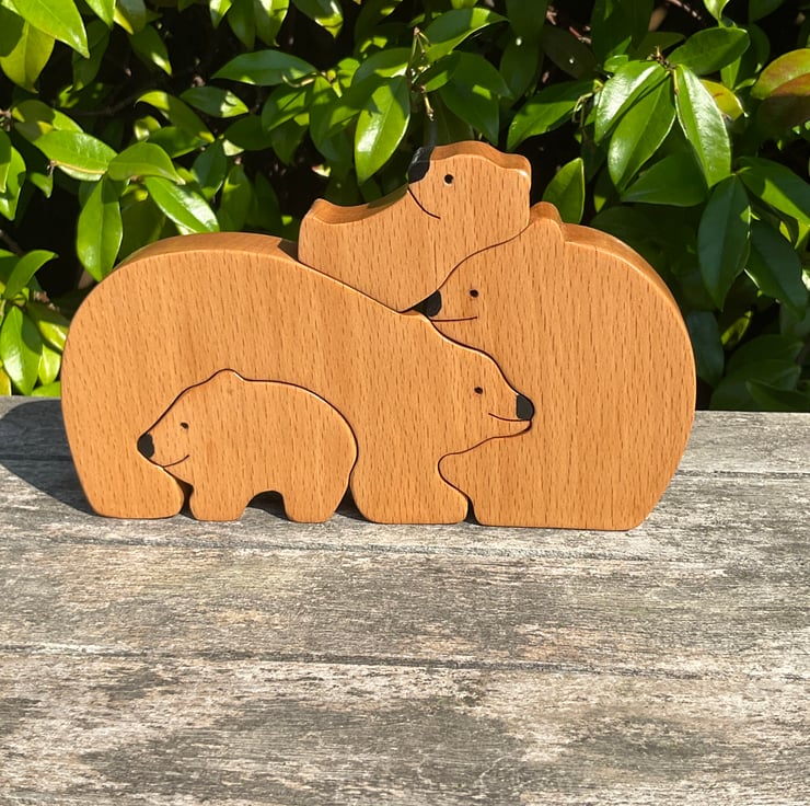 A very charming puzzle of a bear family made from beech wood. The puzzle which is freestanding makes a very attractive ornament. The handmade puzzle has been cut from a solid piece of beech wood, sanded smooth to avoid all sharp edges and corners to provid a very tactile surface. The puzzle is finished in multiple coates of danish oil providing a very durable light gloss finish.