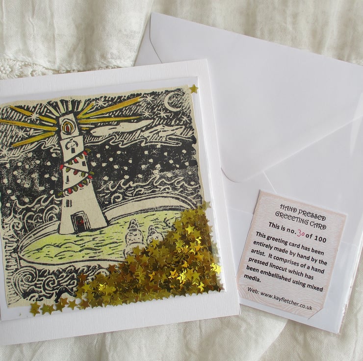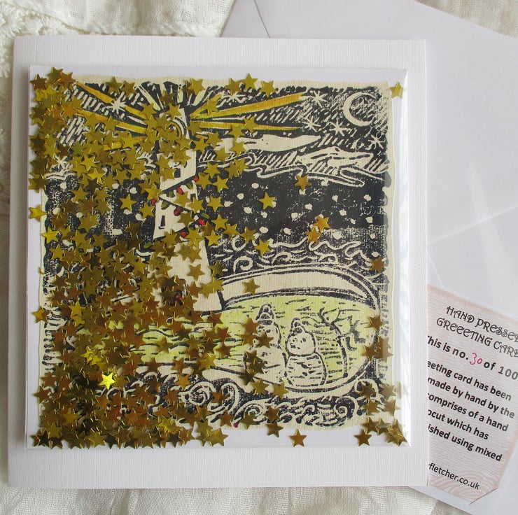 The linocut has been hand printed using Schmincke Aqua Linoldruck Ink (water based) on handmade paper taken from a sketchbook, to which I have added accents using Faber-Castell PITT Artist Pens and other media. The print has been mounted (using Pritt paper glue and self-adhesive Kraft tape) onto white card and encased in an acetate pocket. A handful of tiny gold stars have been dropped inside and the pocket has been sealed and glued to the front of the blank greeting card (white linen textured card 300gsm) using sticky dots.