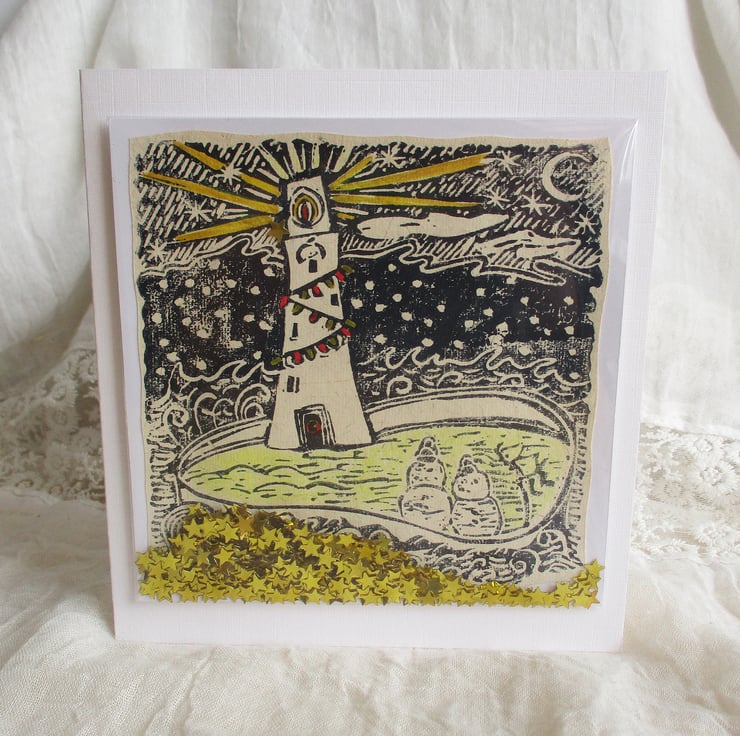 The card features an original linocut of a little fantasy of two snowpeople in a snowy lighthouse garden surrounded by the dark wintry sea.