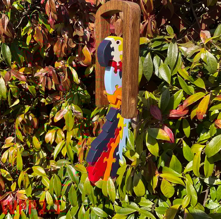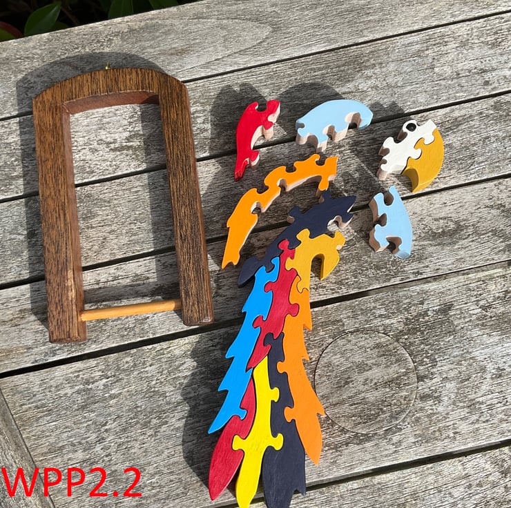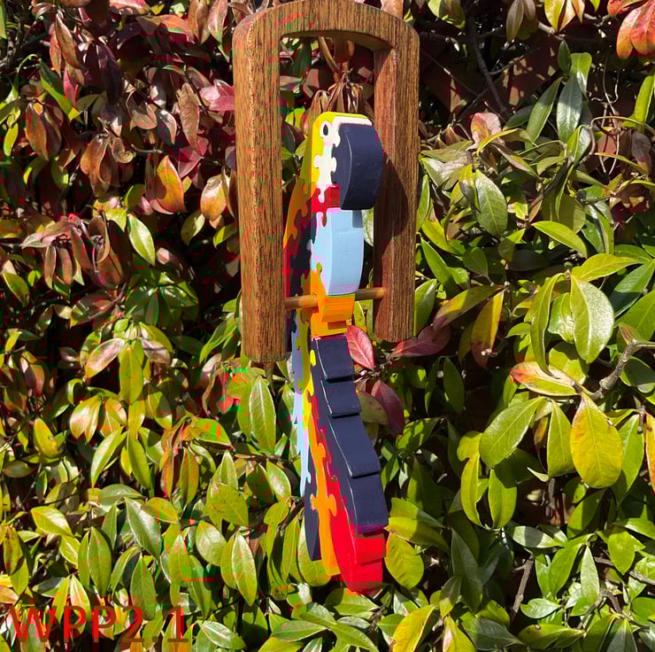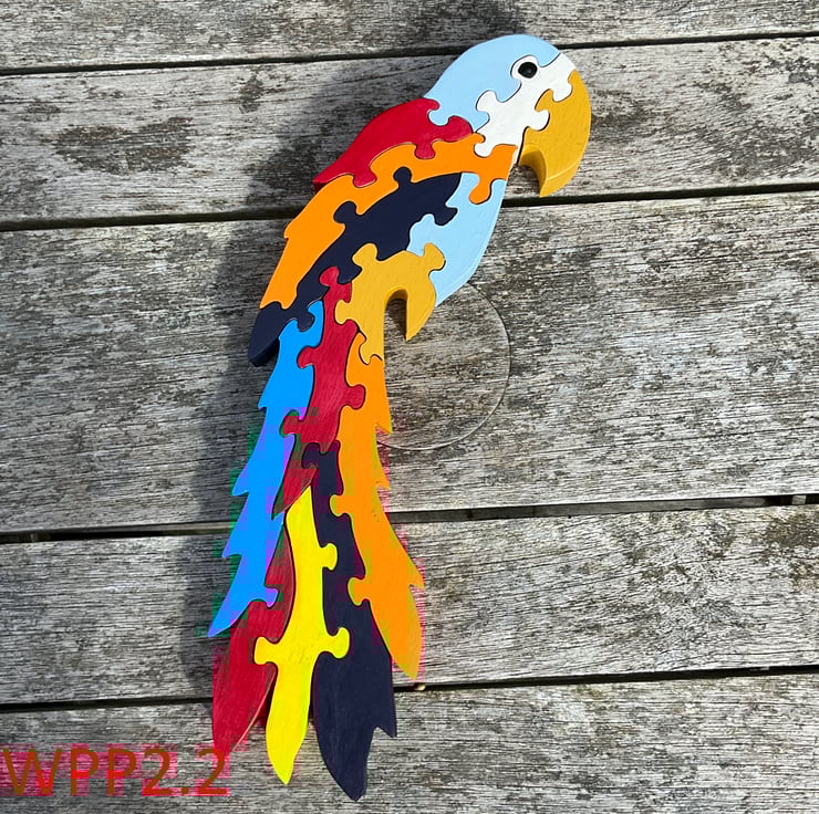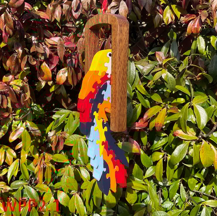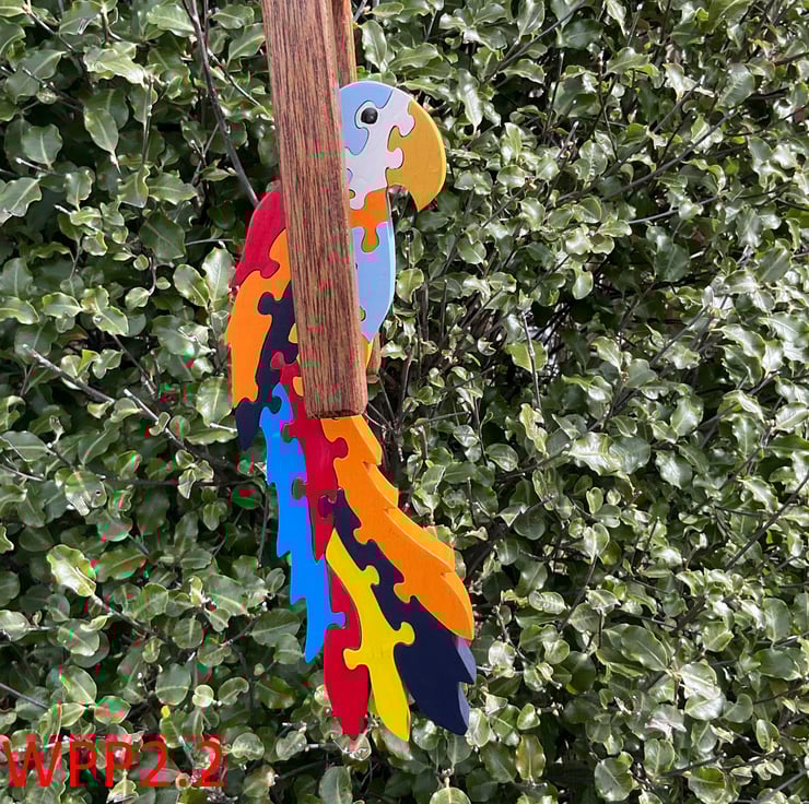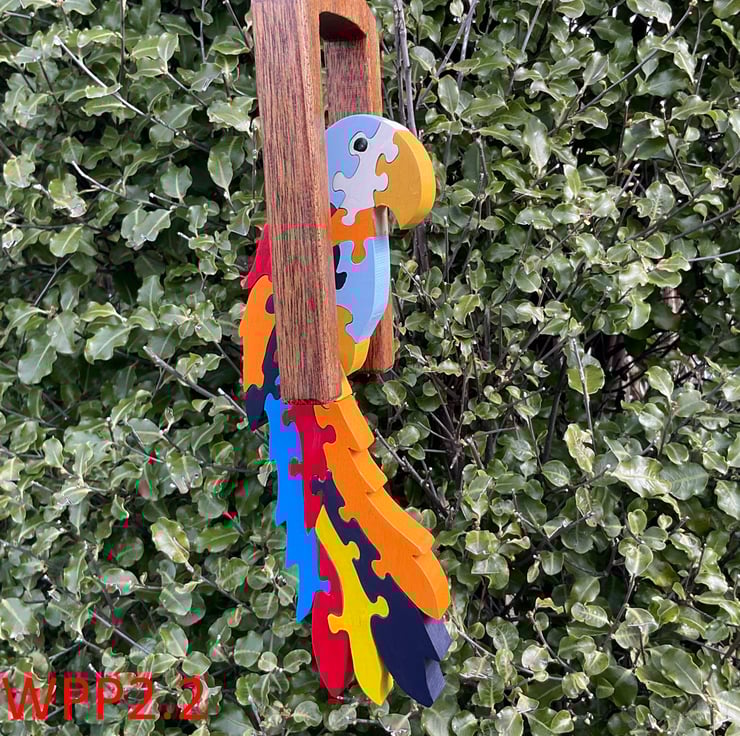 A colourfull parrot puzzle which sits on his (or her) own perch, looks great hanging under a garden sunshade or as decoration in a childs bedroom. The parrot is made from beech wood painted with non toxic paint. The perch is made from meranti, complete with eyelet for hanging.