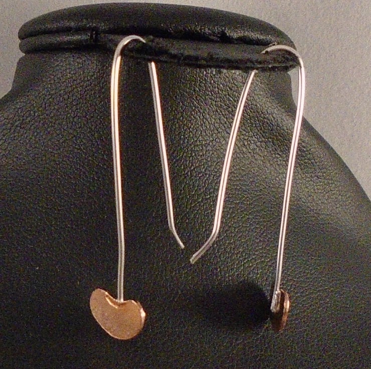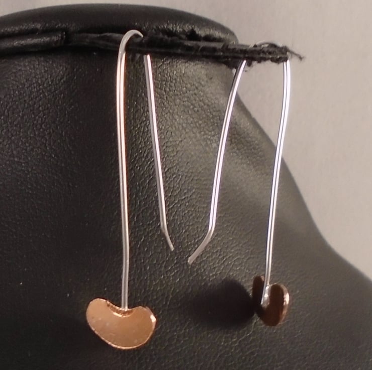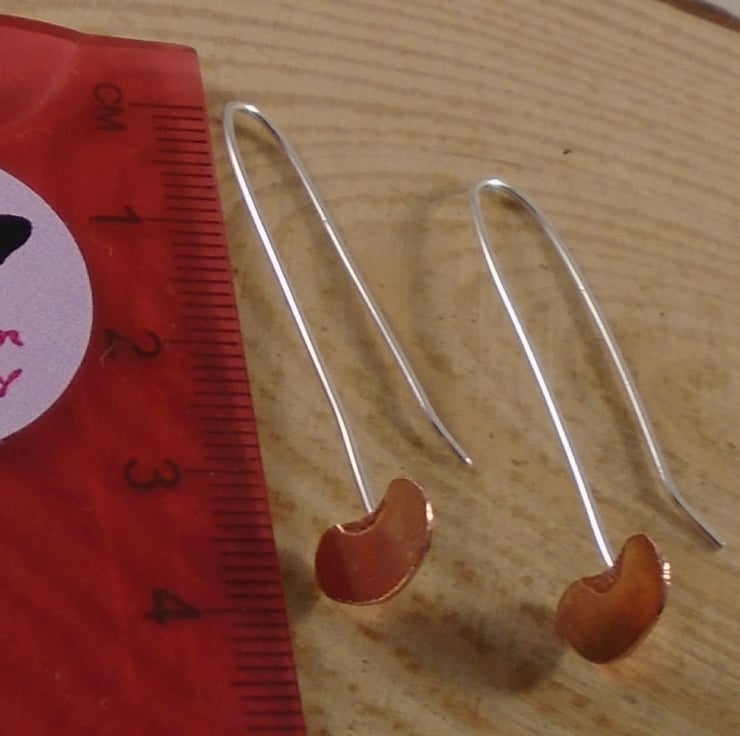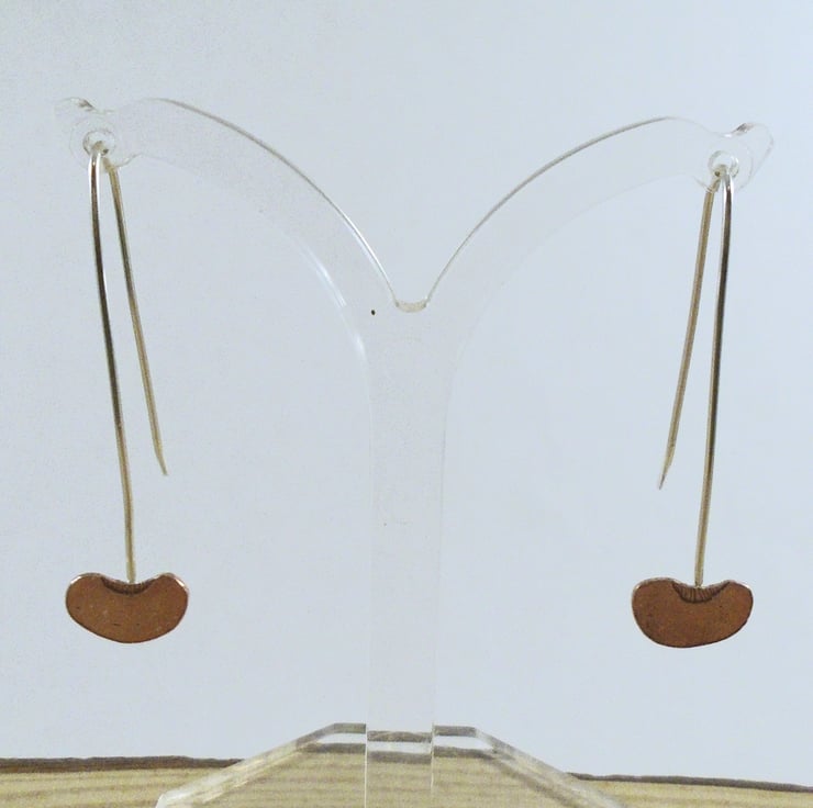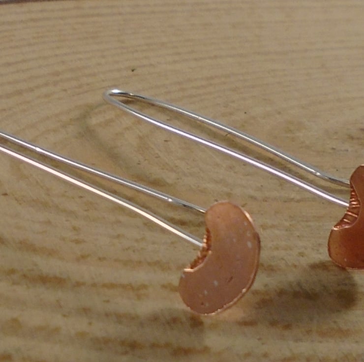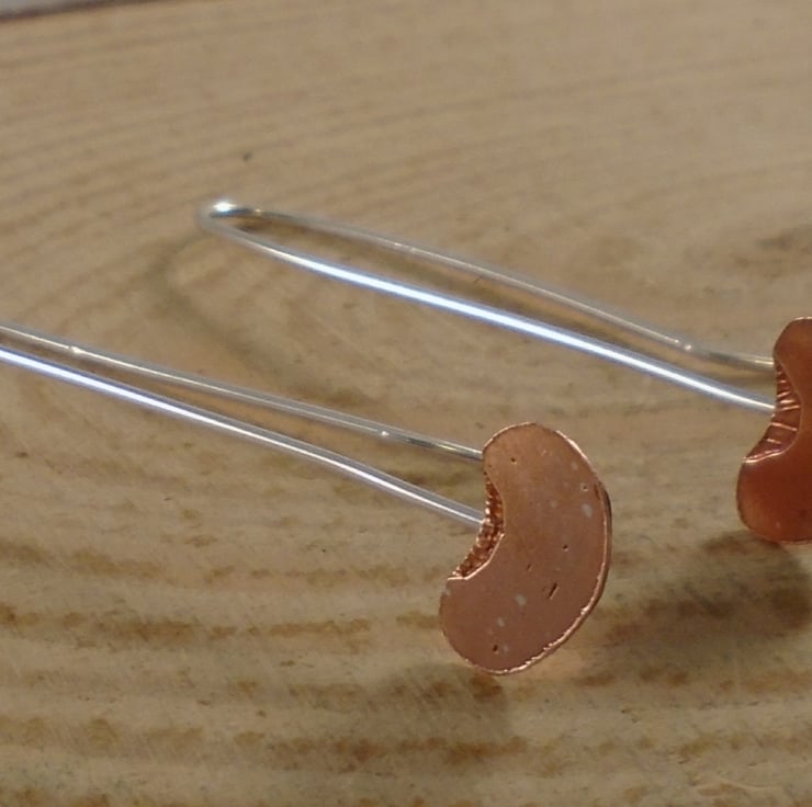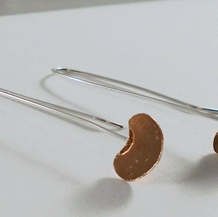 A simple, autumnal pair of earrings, hand made from sterling silver and copper. The shape of the conker has been hand pierced from a sheet of copper, and etched to give the tectured top. Long ear wires have been hand made from sterling silver and soldered to the back.