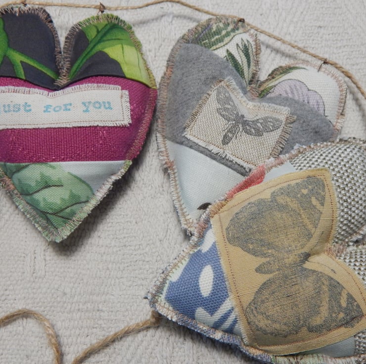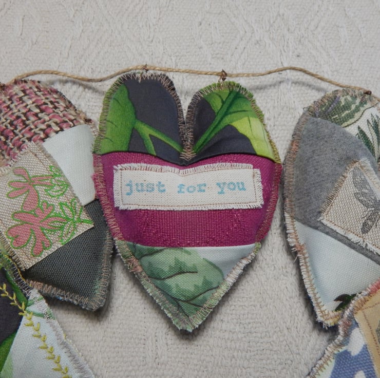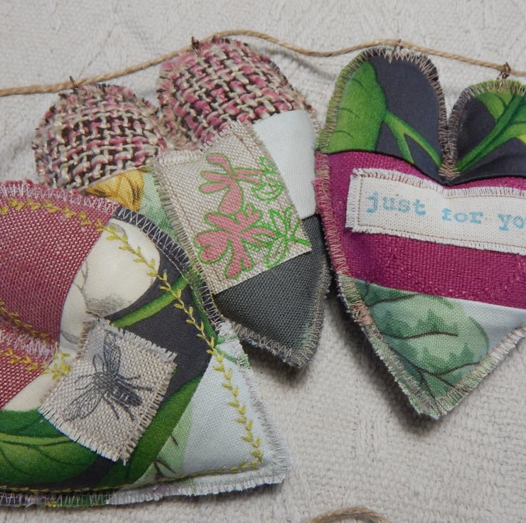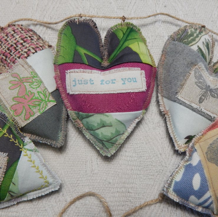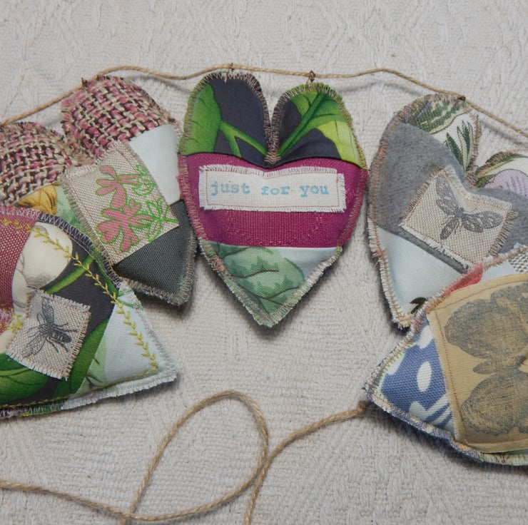 There are 5 hearts measuring approximately 11cm by 9cm at the widest/longest point. They are made of patchwork and have bee, moth and butterfly stamped on to them. There is 1 appliqued pink campion screen printed with hand painted pink flowers. The central heart has a message appliqued on 'just for you'. This would make a caring present for somebody special.