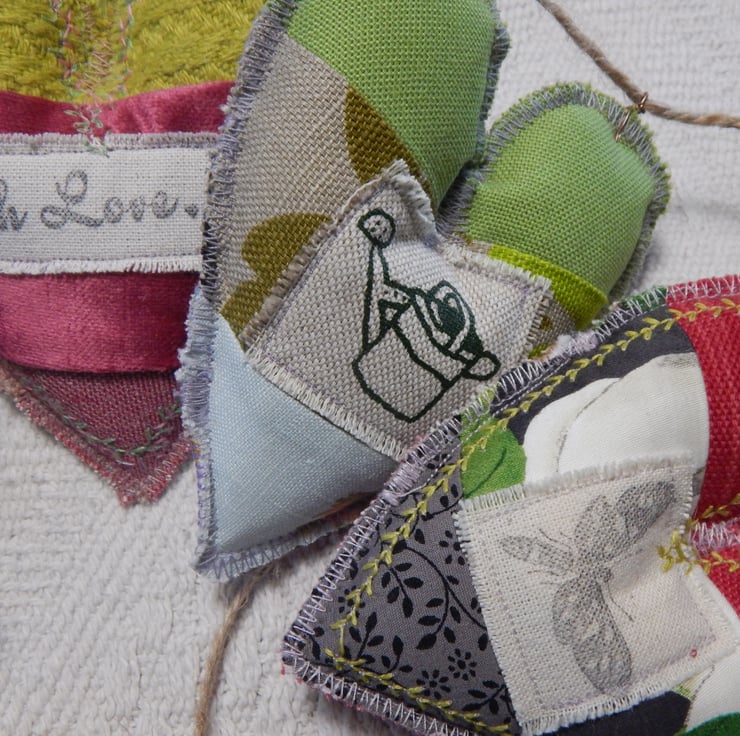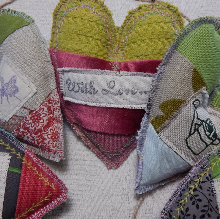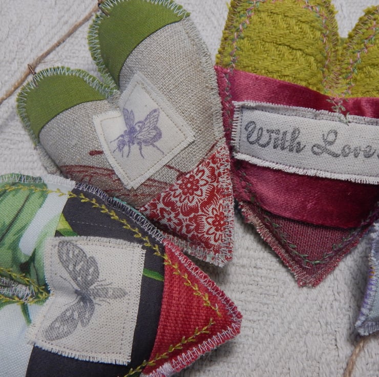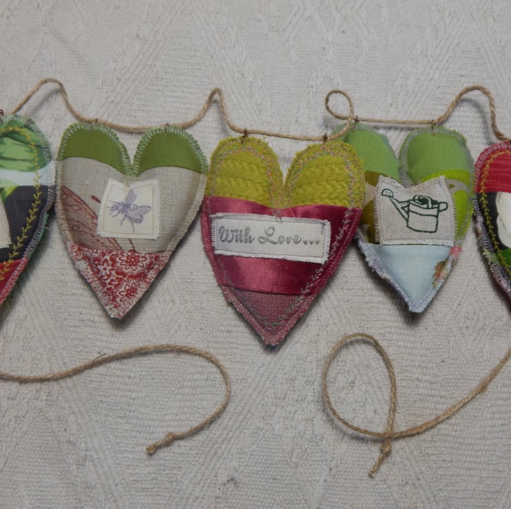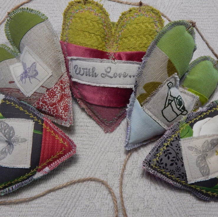 There are 5 hearts measuring approximately 11cm by 9cm at the widest/longest point. They are made of patchwork and have a moth stamped on two and a bee on another. There is 1 watering can appliqued on, which would make this a lovely gift for a gardener. The central heart has a message appliqued on 'With Love'. This would make a caring present for somebody special.