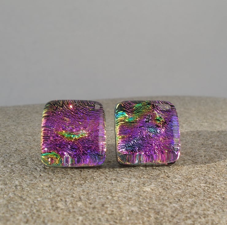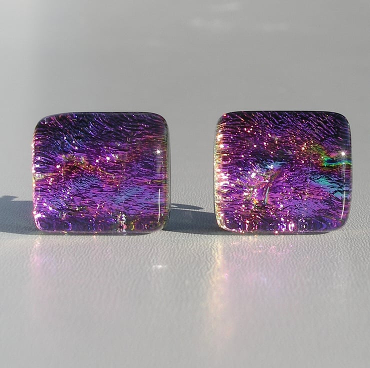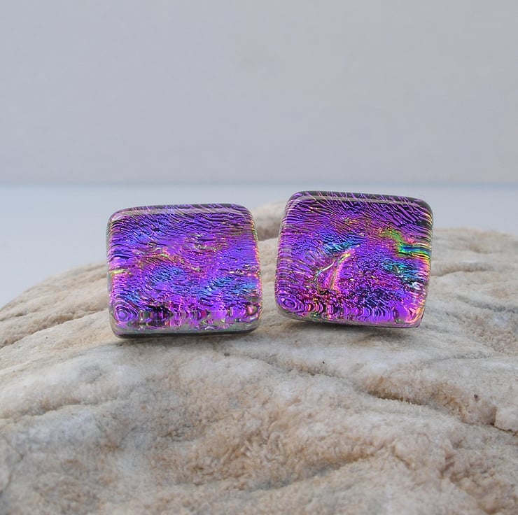 These beautiful stud earrings shimmer in fabulous shades of pink and blue, depending on the angle of the light. Made with lightly textured granite dichroic glass they would be perfect for both day or evening wear and can be combined with the Granite pendant for a matching jewellery set.