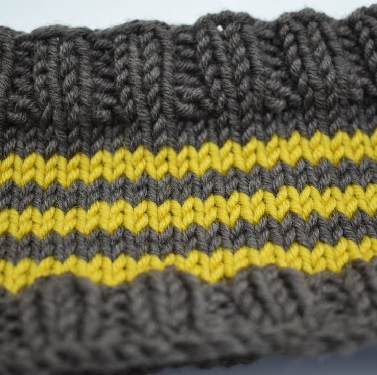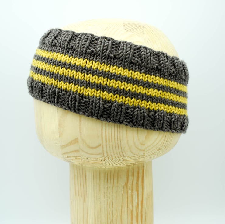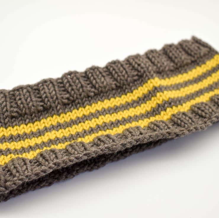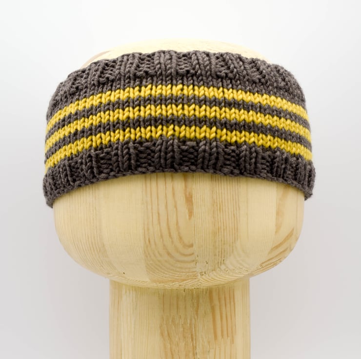 Knitted in beautifully soft 100% merino aran weight yarn in stripes of ochre yellow and brown. This cosy unisex headband can be worn either on it's on or even under a cycle helmet to help keep your ears warm.